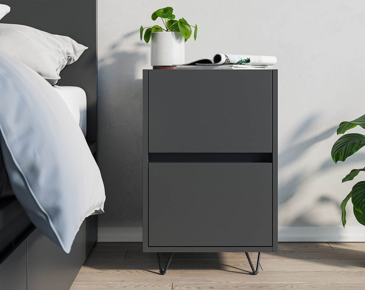 Mit seinen beiden geräumigen Schubladen und der griffloser Soft-Close-Funktion passt der Nachttisch perfekt in moderne Wohnkonzepte. Die klare Linienführung und der Verzicht auf sichtbare Griffe sorgen für ein minimalistisches Erscheinungsbild.