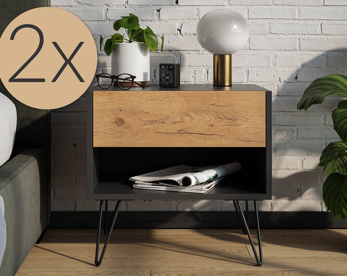 Der Industrial Nachttisch von Posseik kombiniert modernes Design mit praktischer Funktionalität. Der grafitgraue Softtouch-Korpus in Kombination mit täuschend echt wirkenden Eiche-Fronten verleihen dem Möbelstück eine elegante Optik, während die 20 cm hohen Metallfüße den angesagten Industrial-Stil unterstreichen.