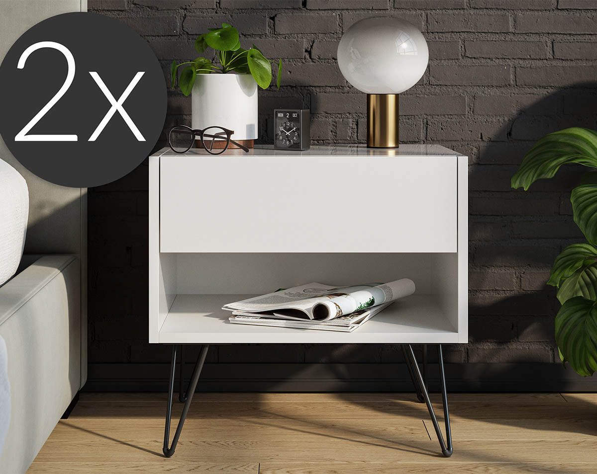 Das Industrial Nachtisch von Posseik kombiniert modernes Design mit praktischer Funktionalität. Die weißen Hochglanzfronten verleihen dem Möbelstück eine elegante Optik, während die 20 cm hohen Metallfüße den angesagten Industrial-Stil unterstreichen.