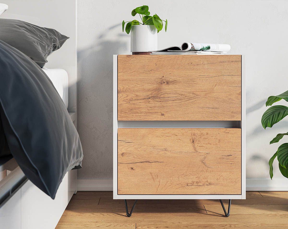 Der Industrial Nachttisch von Posseik kombiniert modernes Design mit praktischer Funktionalität. Der hochglanz-weiße Korpus in Kombination mit täuschend echt wirkenden Eiche-Fronten verleihen dem Möbelstück eine elegante Optik, während die 20 cm hohen Metallfüße den angesagten Industrial-Stil unterstreichen.
