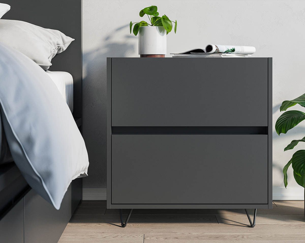 Mit seinen beiden geräumigen Schubladen und der griffloser Soft-Close-Funktion passt der Nachttisch perfekt in moderne Wohnkonzepte. Die klare Linienführung und der Verzicht auf sichtbare Griffe sorgen für ein minimalistisches Erscheinungsbild.