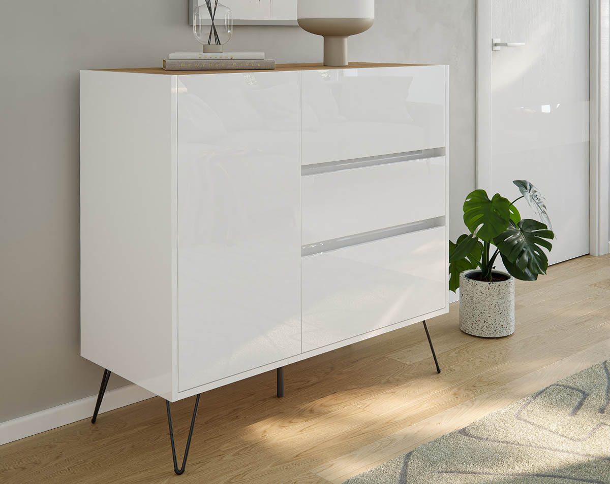 Das Industrial Sideboard von Posseik kombiniert modernes Design mit praktischer Funktionalität. Die weißen Hochglanzoberflächen in Kombination mit der eiche-Deckplatte verleihen dem Möbelstück eine elegante Optik, während die 20 cm hohen Metallfüße den angesagten Industrial-Stil unterstreichen.