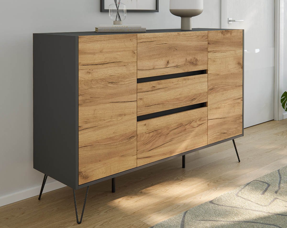 Das Industrial Sideboard von Posseik kombiniert modernes Design mit praktischer Funktionalität. Der grafitgraue Softtouch-Korpus in Kombination mit täuschend echt wirkenden Eiche-Fronten verleihen dem Möbelstück eine elegante Optik, während die 20 cm hohen Metallfüße den angesagten Industrial-Stil unterstreichen.