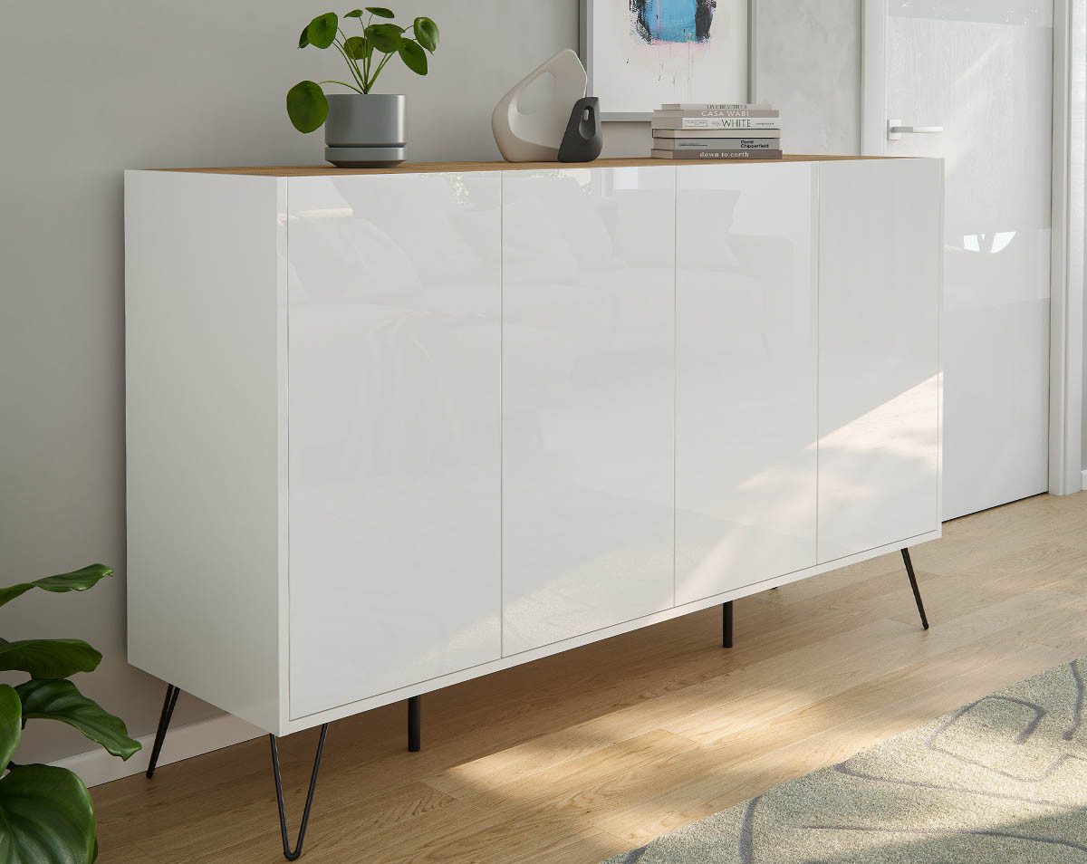 Das Industrial Sideboard von Posseik kombiniert modernes Design mit praktischer Funktionalität. Die weißen Hochglanzoberflächen in Kombination mit der eiche-Deckplatte verleihen dem Möbelstück eine elegante Optik, während die 20 cm hohen Metallfüße den angesagten Industrial-Stil unterstreichen.