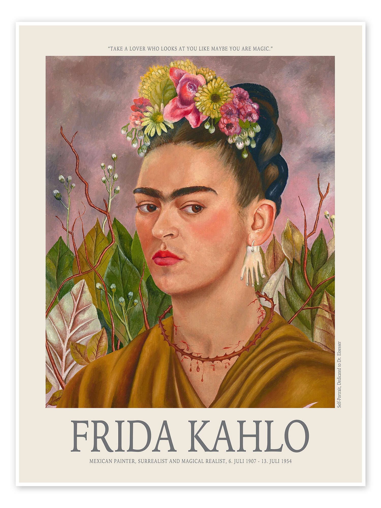 Das Poster „Selbstbildnis, Dr. Eloesser gewidmet II“ (771818) aus dem Меню des Kunstverlags Posterlounge wird Sie mit intensiven Farben und hervorragender Kunstdruck-Qualität begeistern. Der hochwertige, leicht glänzende Druck auf kräftigem Premiumpapier (250 g/m²) macht das Bild von Frida Kahlo zu einem echten Hingucker für Ihr Zuhause. Durch den 3 mm breiten weißen Rand, der in allen Formaten inbegriffen ist, wird das Motiv hervorgehoben und wirkt besonders edel.