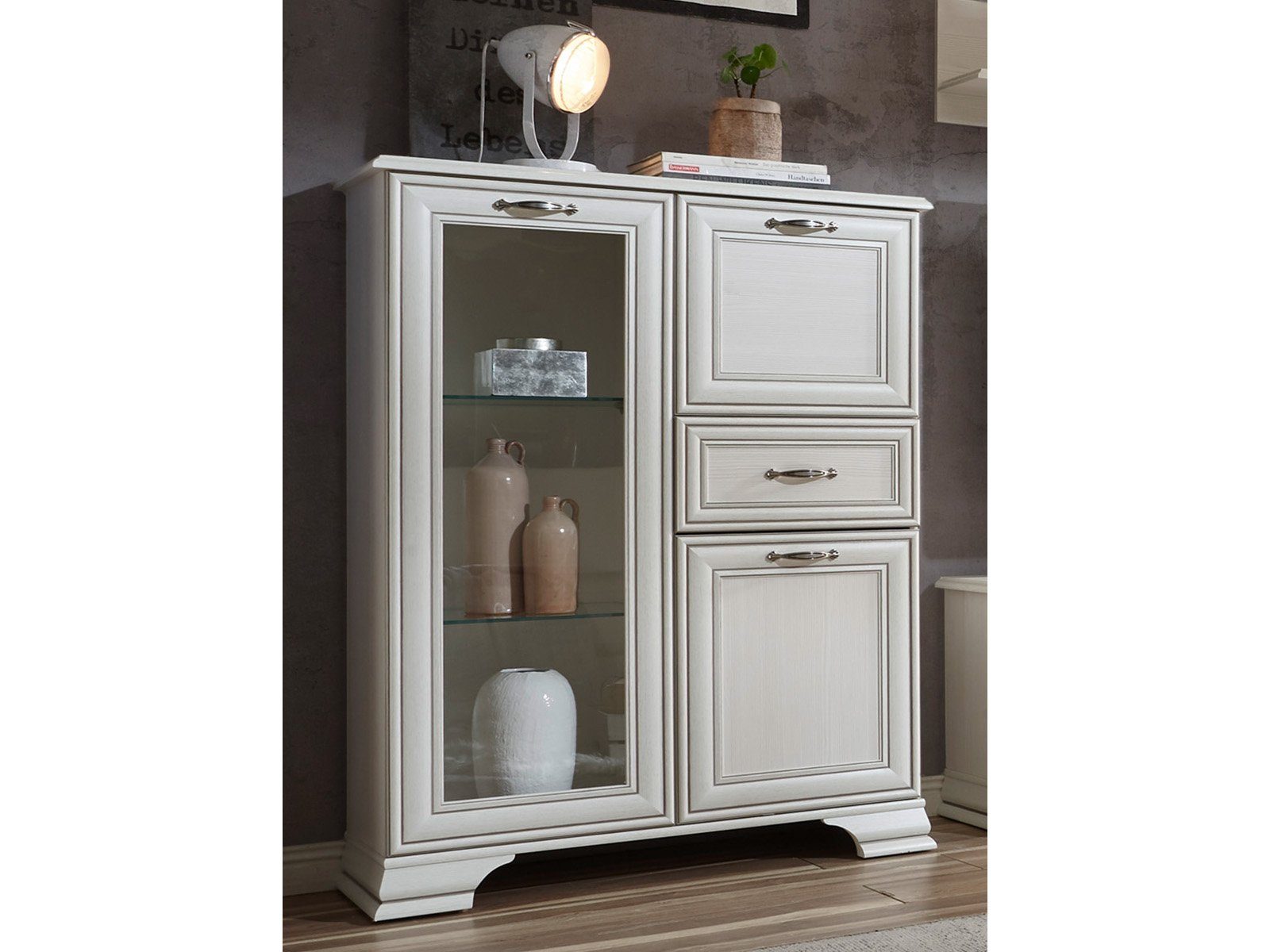 "Valeria I" überzeugt nicht nur durch sein attraktives Landhaus-Design, sondern auch in puncto Stauraum. Mit 2 Glasböden hinter 1 Glas-/Holztür und 1 Einlegeboden hinter 1 Holztür, sowie durch 1 Klappe und 1 geräumigen Schubkasten sorgt es für Ordnung in z. B. Wohn- oder Esszimmer. Die Glas-/Holztür sorgt hier nicht nur den besten Durchblick, sondern rundet das Gesamterscheinungsbild des Highboards gekonnt ab. Der großzügige Oberboden stellt hier nicht nur eine zusätzliche Ablage- bzw. Abstellfläche dar, sondern lädt zum Dekorieren geradezu ein.