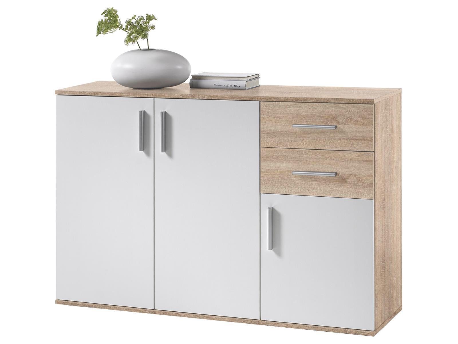 Die Kommode "Freida II" ist hier in der Kombination von klarem Weiß mit gemütlichem Sonoma dunkel Nachbildung erhältlich. Diese Варіанти lässt sich in bereits bestehende Farbkonzepte integrieren und bereichert diese mühelos.