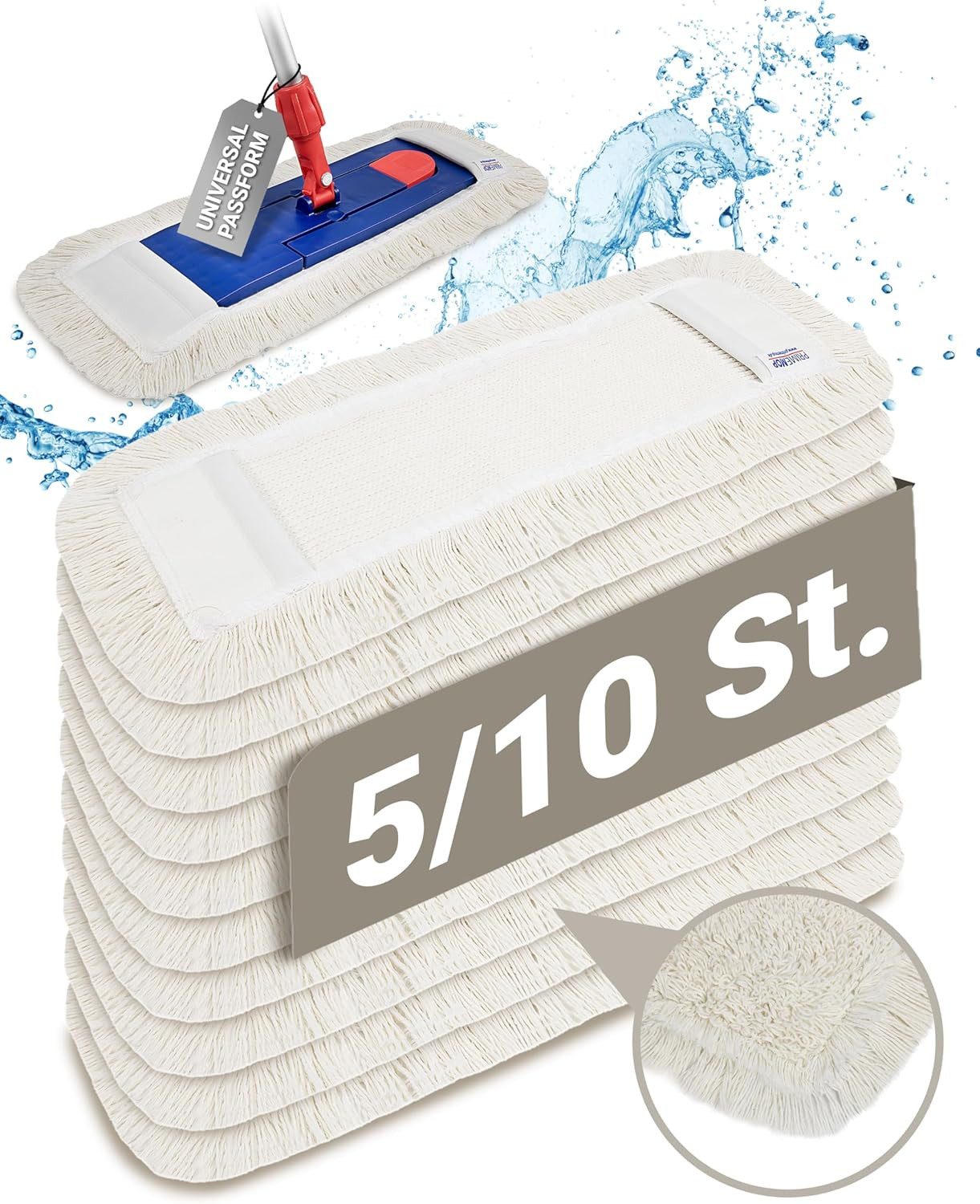 PROFI-QUALITÄT – Verstärkte Seitentaschen und extra feste Nähte sorgen bei unserem Wischmopp 50cm für außergewöhnliche Haltbarkeit und Festigkeit. Ideal für den professionellen und privaten Einsatz. HOCHWERTIGE BAUMWOLLE – Mop aus fusselfreier Baumwolle mit VTS-Verfahren für optimale Schmutzaufnahme und Reinigungsleistung. Waschbar bis 95°C, bietet unser Wischbezug eine unübertroffene Langlebigkeit. VIELSEITIG & EFFIZIENT – Unser Wischmop 50cm ist entwickelt für alle wasserbeständigen Flächen - perfekt für Kunststoff, Keramik, Glas, Metall und mehr. Schnelltrocknend und schonend für alle Oberflächen. UNIVERSAL PASSFORM – Unser Wischmopp Baumwolle passt auf alle 50cm Klapphalter. Erleichtert die Bodenreinigung in Gewerbe und Zuhause durch einfache Handhabung und schnellen Verstärkte Wechsel. UMWELTFREUNDLICH – Wiederverwendbar und waschbar, bietet unser Wischmopp Bodenwischer eine umweltfreundliche Alternative zu Einweg-Produkten.