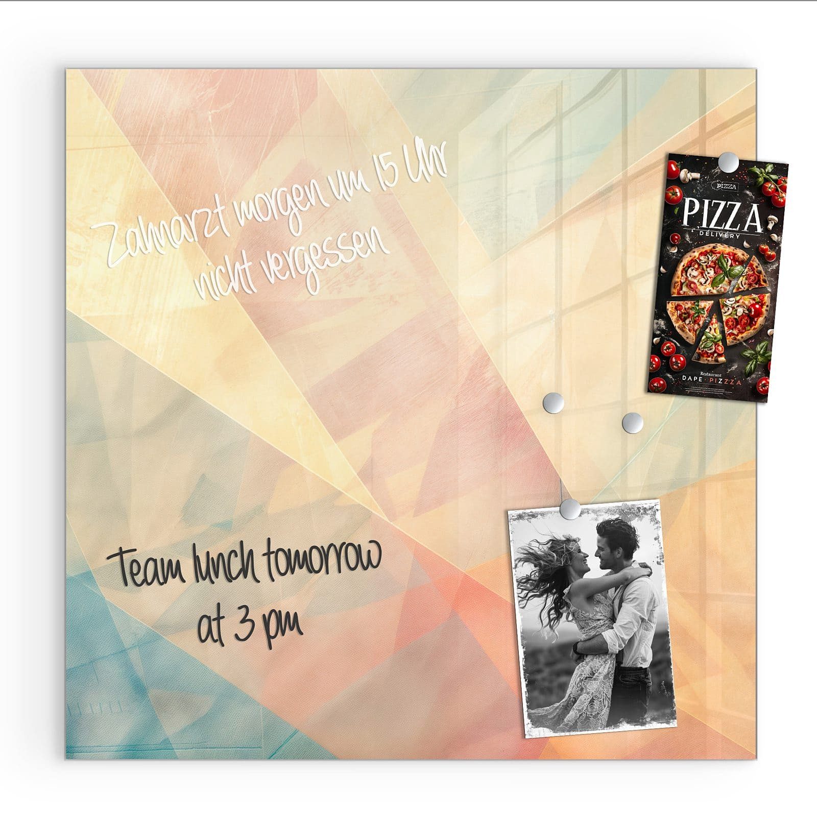 Mit einer Розмір von 30x30 cm ist diese Magnetpinnwand mit dem Motiv Farbiges Geo Muster die ideale Lösung für Ihre Notizen, Fotos oder als dekoratives Element in Ihrem Zuhause. Die rückseitigen Ausbuchtungen sorgen für einen eleganten Schwebeeffekt, der den Raum optisch aufwertet.