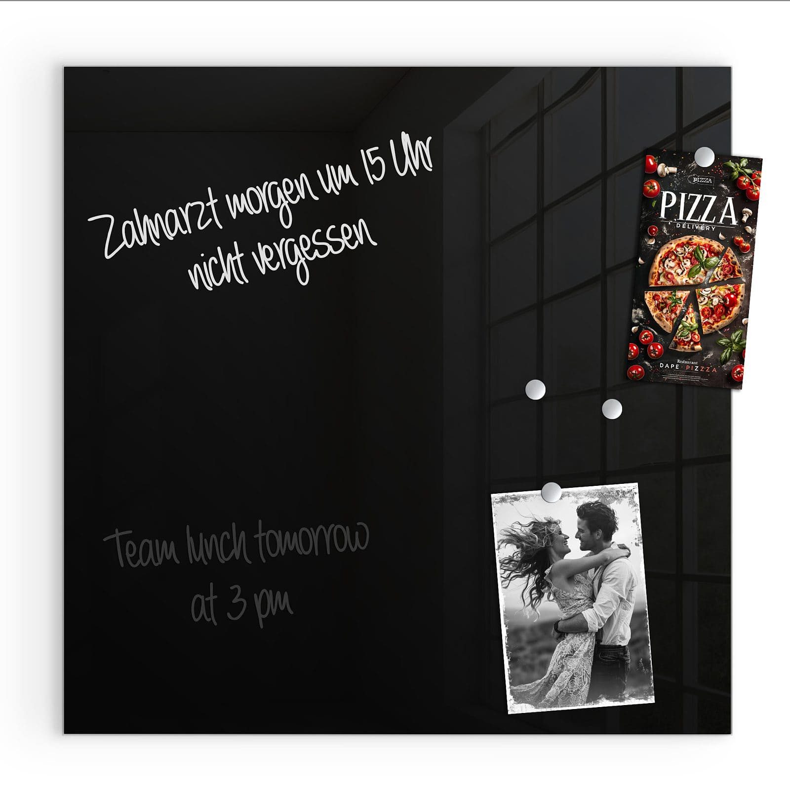 .Ausstattung | Enthält 2 Neodym-Magnete, 1 Stift, 1 Reinigungstuch; magnetisch haftend, beschreibbar, aus 4 mm starkem Sicherheitsglas (ESG) |