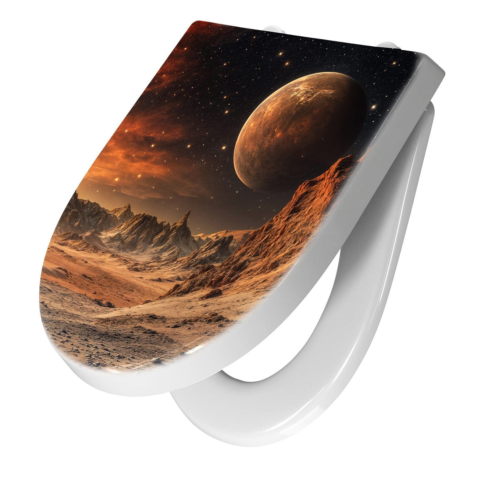 Ein besonderes Highlight ist das brillante Motiv Fremder Planet, das per UV-Direktdruck auf den WC-Deckel aufgebracht ist. Diese langlebige Drucktechnik sorgt für eine kratzfeste, farbintensive Oberfläche, die auch nach häufigem Gebrauch optisch überzeugt. Dank unserer großen Auswahl an Motiven setzen Sie mit jedem Sitz ein individuelles Design-Statement im Bad.