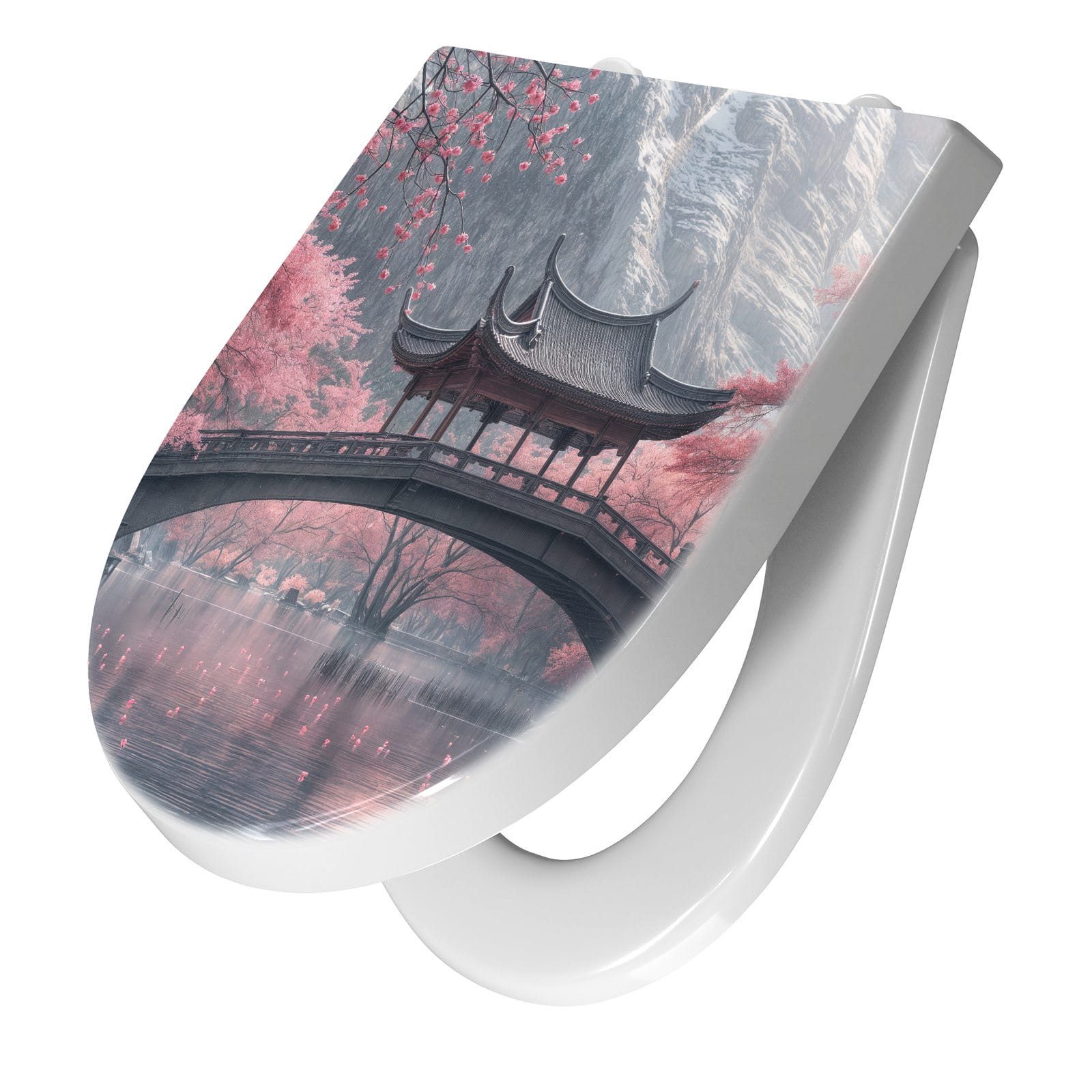 Ein besonderes Highlight ist das brillante Motiv Japanischer Garten, das per UV-Direktdruck auf den WC-Deckel aufgebracht ist. Diese langlebige Drucktechnik sorgt für eine kratzfeste, farbintensive Oberfläche, die auch nach häufigem Gebrauch optisch überzeugt. Dank unserer großen Auswahl an Motiven setzen Sie mit jedem Sitz ein individuelles Design-Statement im Bad.