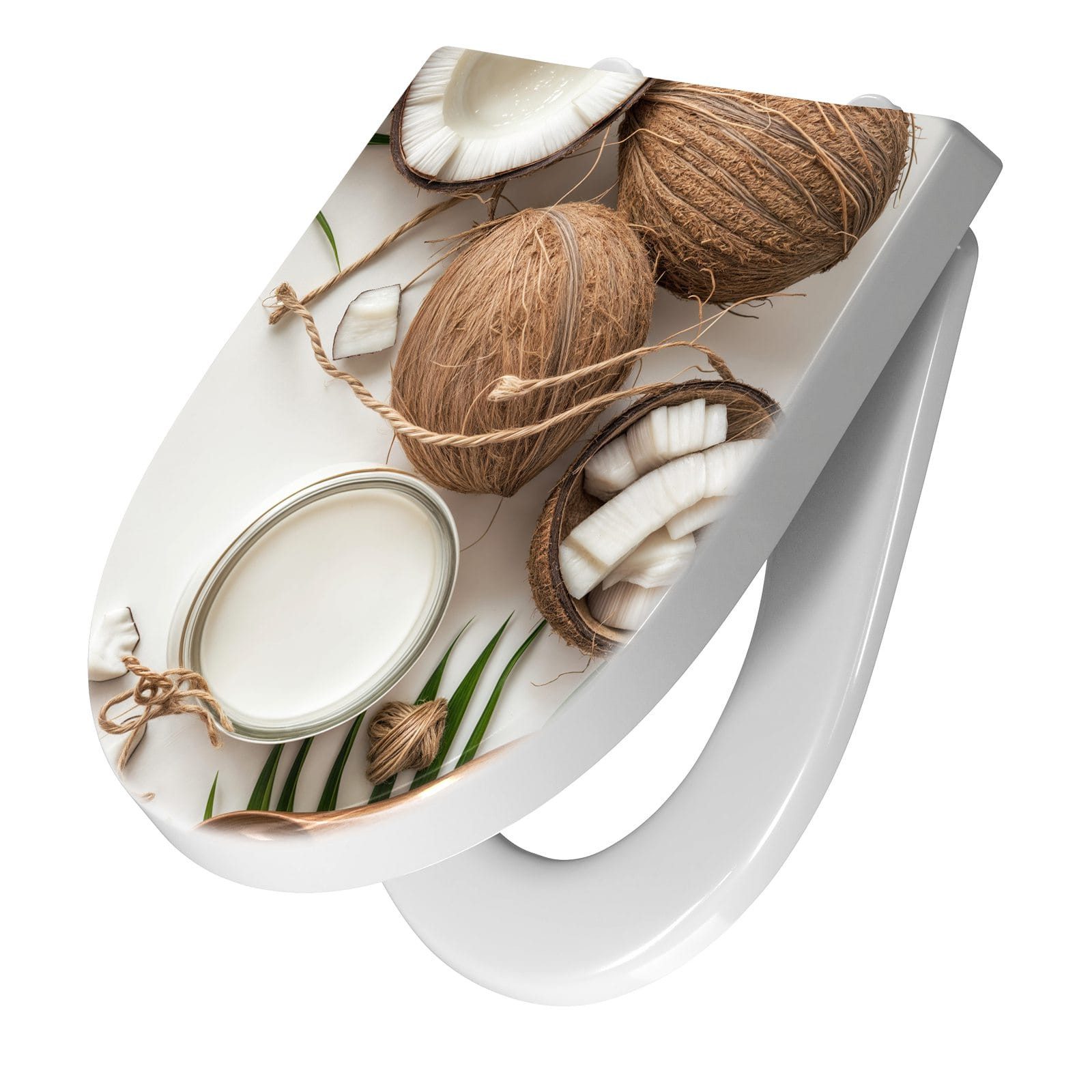 Ein besonderes Highlight ist das brillante Motiv Kokosnüsse und Blätter, das per UV-Direktdruck auf den WC-Deckel aufgebracht ist. Diese langlebige Drucktechnik sorgt für eine kratzfeste, farbintensive Oberfläche, die auch nach häufigem Gebrauch optisch überzeugt. Dank unserer großen Auswahl an Motiven setzen Sie mit jedem Sitz ein individuelles Design-Statement im Bad.