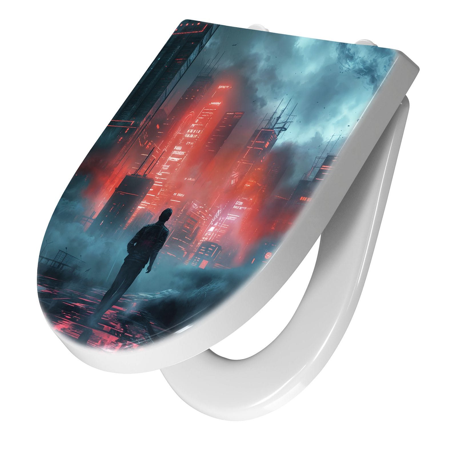 Ein besonderes Highlight ist das brillante Motiv Neonstadt, das per UV-Direktdruck auf den WC-Deckel aufgebracht ist. Diese langlebige Drucktechnik sorgt für eine kratzfeste, farbintensive Oberfläche, die auch nach häufigem Gebrauch optisch überzeugt. Dank unserer großen Auswahl an Motiven setzen Sie mit jedem Sitz ein individuelles Design-Statement im Bad.