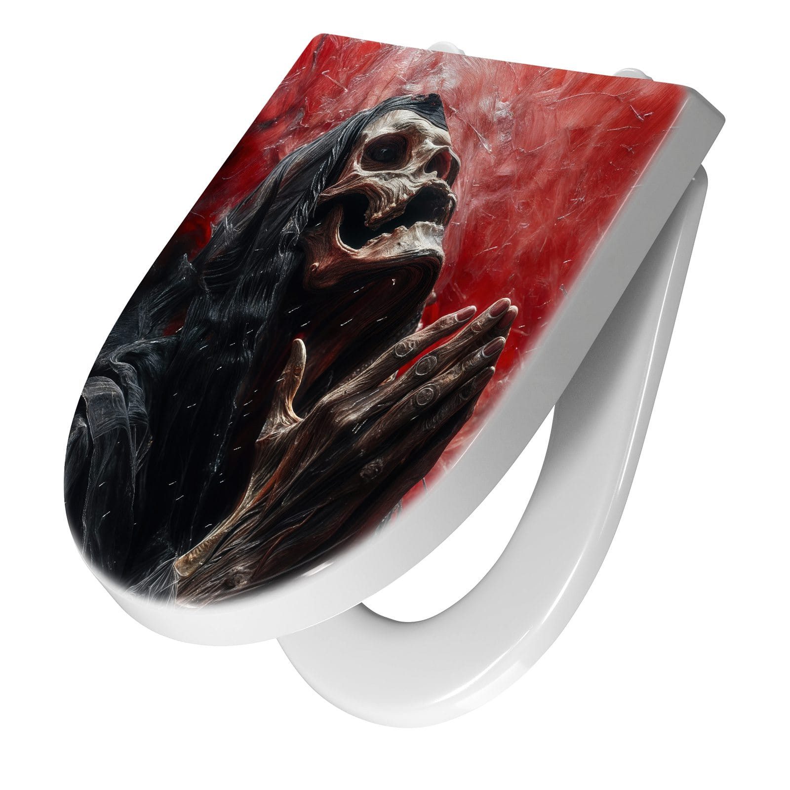 Ein besonderes Highlight ist das brillante Motiv Skelettbetende Hände, das per UV-Direktdruck auf den WC-Deckel aufgebracht ist. Diese langlebige Drucktechnik sorgt für eine kratzfeste, farbintensive Oberfläche, die auch nach häufigem Gebrauch optisch überzeugt. Dank unserer großen Auswahl an Motiven setzen Sie mit jedem Sitz ein individuelles Design-Statement im Bad.
