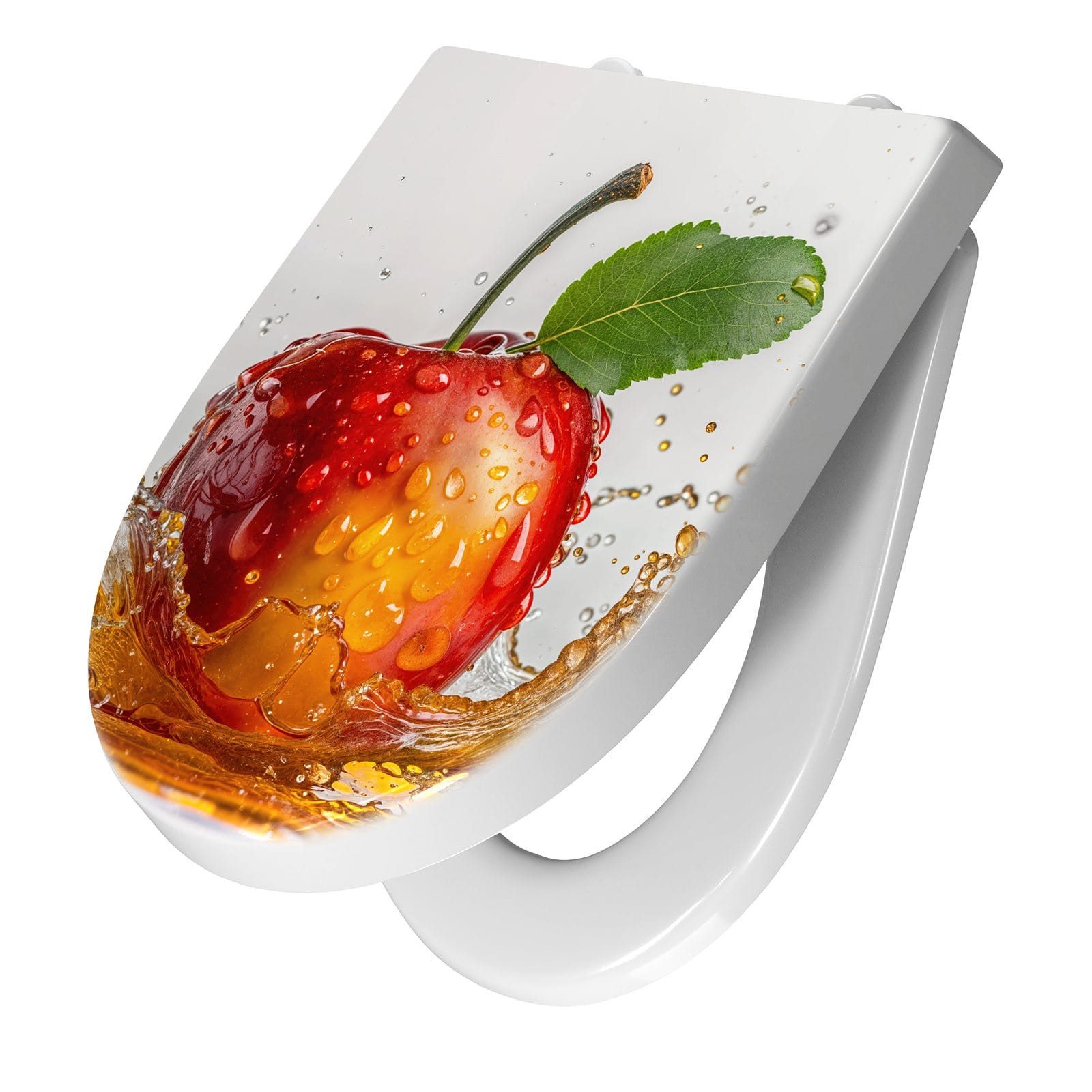 Ein besonderes Highlight ist das brillante Motiv Spritzender Apfel, das per UV-Direktdruck auf den WC-Deckel aufgebracht ist. Diese langlebige Drucktechnik sorgt für eine kratzfeste, farbintensive Oberfläche, die auch nach häufigem Gebrauch optisch überzeugt. Dank unserer großen Auswahl an Motiven setzen Sie mit jedem Sitz ein individuelles Design-Statement im Bad.