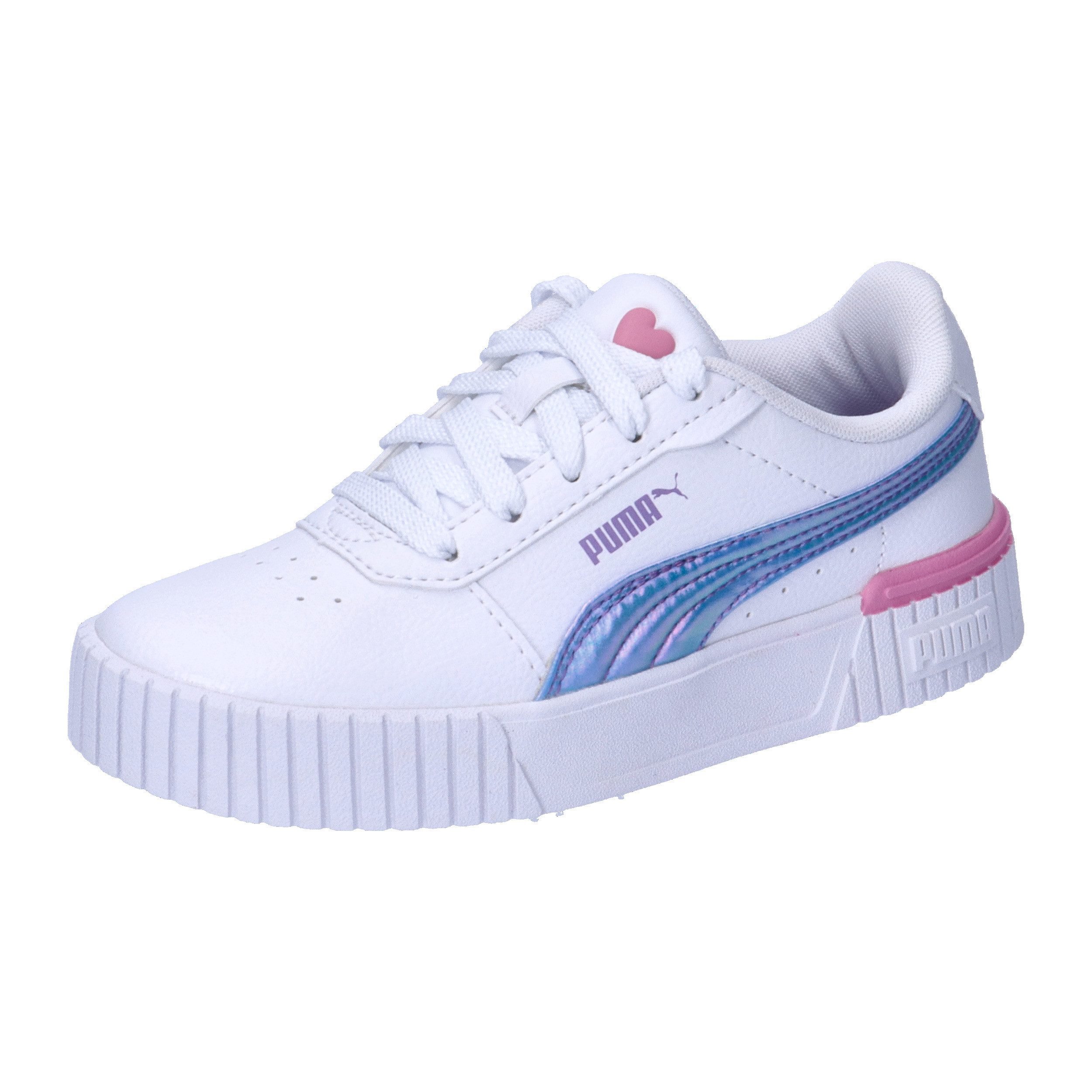 Puma Mädchen Sneaker Carina 2.0 Bouncy Sky PS. Carina 2.0 ist von den Stilen der 80er Jahre inspiriert. Diese neue Tennissilhouette wurde so interpretiert, dass sie zum heutigen entspannten Sneaker-Look kalifornischer Strandstädte passt. Diese Neuauflage behält das vertraute Erscheinungsbild bei, wurde jedoch mit sinnvollen und kommerziellen Neuerungen wie dem neuen Werkzeugdesign aktualisiert: Breitere vertikale Linien sowie das PUMA-Logo auf der Ferse sorgen für einen jungen und straßentauglichen Look. Willkommen im Land der Sanftheit, wo die Grenzen zwischen Realität und Fantasie nahtlos verschwimmen. Ein Wunderland, in dem Sie sich fallen und davontreiben lassen können. Die wahren Stars dieser Kollektion sind die verschiedenen holografischen Materialien, die das Lichtspiel auf Seifenblasen einfangen. Gepolsterte Elemente für zusätzliche Weichheit und geprägte Details für einen modernen Touch machen dieses Paket aus recycelten Materialien zu einem echten Sinneserlebnis. Obermaterial: Leder, Sonstiges Material. Futter und Decksohle: Textil. Laufsohle: Sonstiges Material.