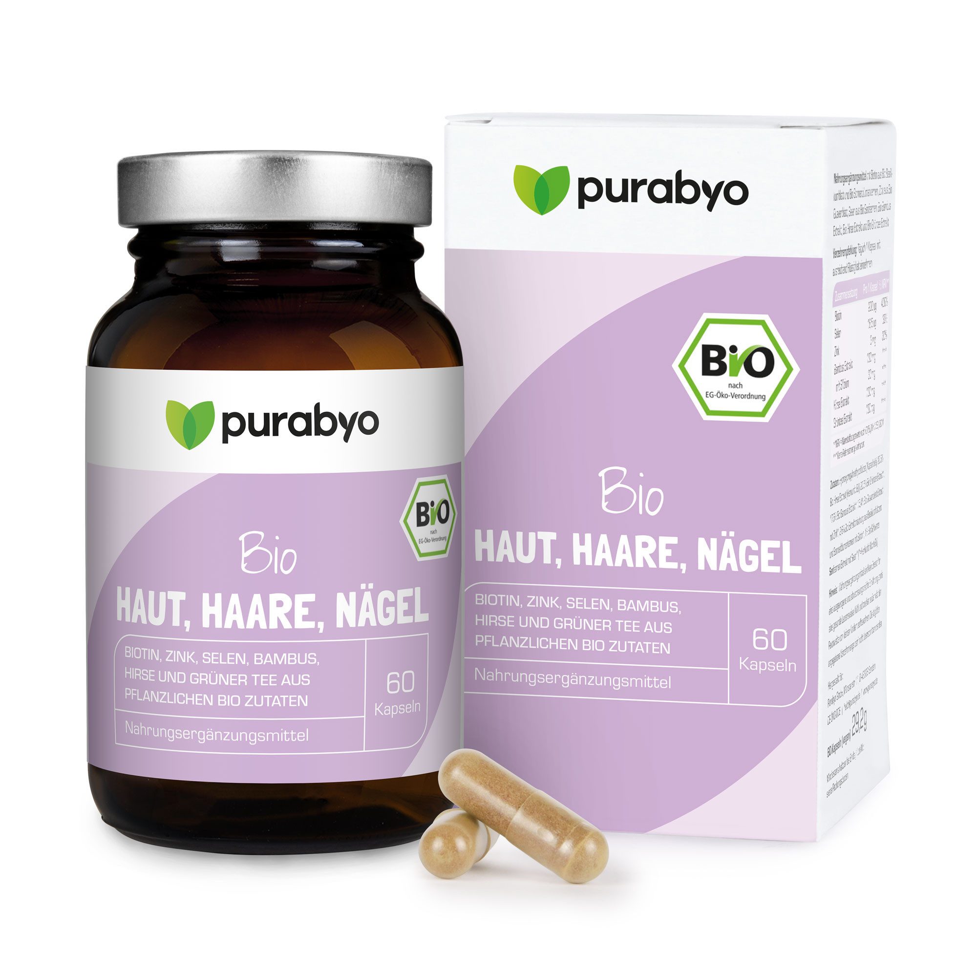 Zutaten | ydroxypropylmethylcellulose (Kapselhülle), 20,5% Bio Hirse Extrakt (Herkunft: EU), 20,5% Bio Grüntee Extrakt*, 17,6% Bio Bambus Extrakt*, 15,4% Bio Guaveblatt Extrakt mit Zink*, 2,6% Bio Extraktmischung aus Basilikumblättern und Sonnenblumenkernen mit Biotin*, 1% Bio Schwarze Senfsamen Extrakt mit Selen* (*=Herkunft: Nicht-EU) |