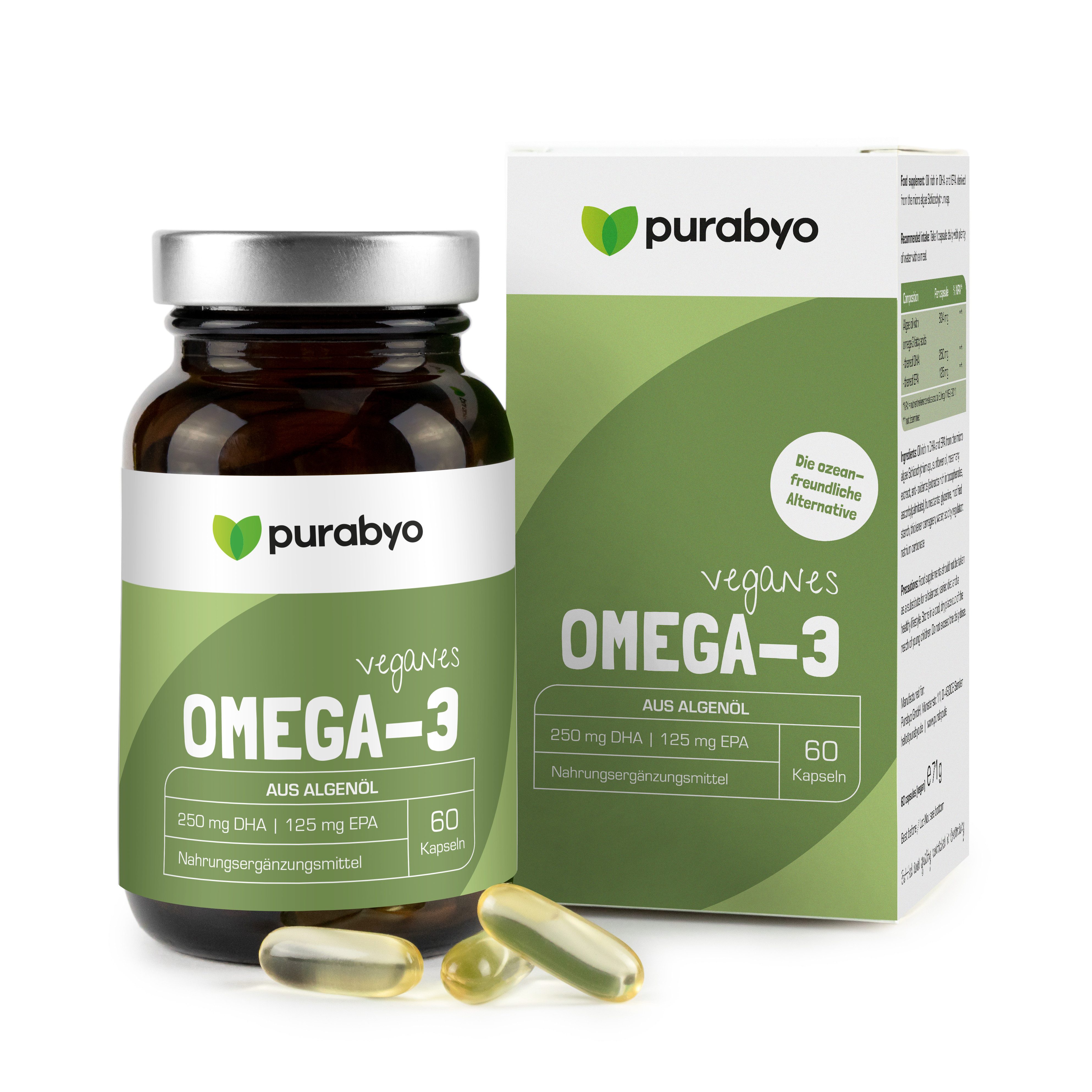 Mit Omega 3 Algenöl von Purabyo profitierst du von einer hochwertigen, veganen Quelle für Omega-3 Fettsäuren. Das Öl hat einen mit 125 mg pro Kapsel verhältnismäßig hohen EPA-Gehalt. Die Algen werden in den USA angebaut, das Produkt wird von uns abgefüllt und kontrolliert in Deutschland. Die veganen Softgels aus Mais-Stärke sind leicht zu schlucken. Das Öl ist gut verträglich und es kommt zu keinem unangenehmen Aufstoßen. Die hohe Frische wird durch einen niedrigen Oxidationswert gewährleistet.Bezeichnung des Nahrungsergänzungsmittels | Nahrungsergänzungsmittel mit DHA- und EPA-reichem Öl aus der Mikroalge Schizochytrium sp. |