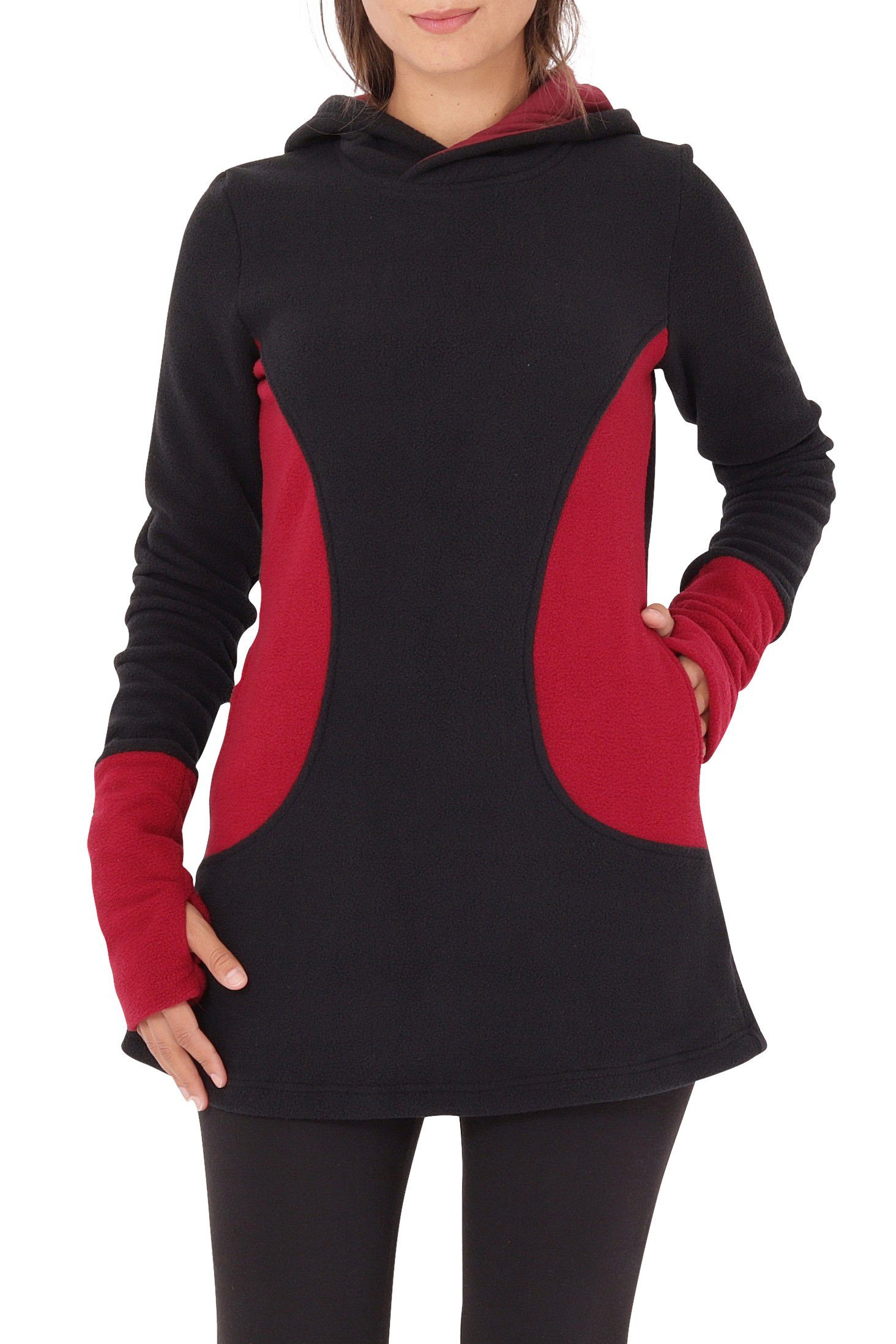 Das zweifarbige langärmlige Fleece-Kleid mit Taschen ist perfekt für Winter und Übergangszeit. Es ist ausgestattet mit Seitentaschen und Kapuze.