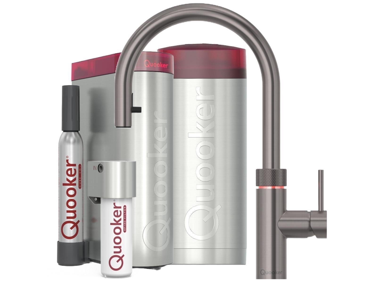 Der Wasserhahn, der alles kann Die neue Funktion bringt noch mehr Freude in die Küche. Sie spart Zeit und Raum, macht die Verwendung von Plastikflaschen überflüssig und ist völlig sicher. Um sprudelndes Wasser zu erhalten, drücken und drehen Sie den geriffelten Ring. Der Leuchtring, der bei kochendem Wasser rot leuchtet, blinkt nun blau: Sprudelwasser ist im Anmarsch. Halten Sie den Knopf ein wenig länger gedrückt, erhalten Sie stilles Wasser aus dem Wasserhahn und der Leuchtring färbt sich durchgängig blau. Es ist also nicht möglich, versehentlich kochendes Wasser zu zapfen, obwohl man eigentlich gekühltes Wasser entnehmen wollte. Der CUBE befindet sich in Ihrem Küchenschrank neben oder vor dem Quooker-Reservoir. Das Reservoir wird mit einem CO2-Zylinder verbunden, mit dem Sie aus Ihrem Quooker-Hahn 60 Liter gekühltes Sprudelwasser genießen. Es ist auch ein größerer 3kg CO2-Zylinder erhältlich, mit dem Sie 420 Liter zapfen können. Beide Produkte sind über unseren Webshop erhältlich. Die Wasserqualität erfordert bundesweit nicht, dass der CUBE mit einem Filter betrieben wird. Sofern Sie allerdings den CUBE gerne mit einem Filter ausstatten möchten oder Ihre Wasserregion dies verlangt, ist dieser hier verfügbar. Der Filter besteht aus einem Aktivkohle- und Hohlfaserelement. Er reduziert die Konzentration an Mikroorganismen sowie Partikel wie Sand und Schwebstoffe. Ein Filter hält 12 Monate. Der CUBE gibt ein akustisches Signal ab, wenn der Filter ausgetauscht werden muss. |