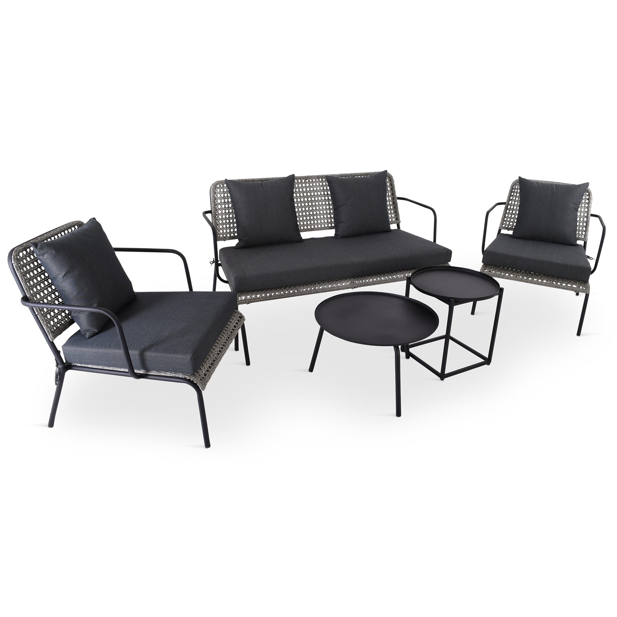 DESIGN & HAPTIK: Moderne, 5-tlg. Raburg XL Garten-Lounge Anisa mit Sofa, 2 Sesseln & 2 kleinen Tischen für Garten, Terrasse, Balkon & Wintergarten, exklusiv & zeitlos aus Flachband Poly-Rattan, mit 7 waschbaren Kissen aus 100 % Polyester in Dunkel-Grau-Meliert, Gestell & Tische aus pulverbeschichtetes Metall in Seiden-Schwarz, grobe & feste Stoffqualität
