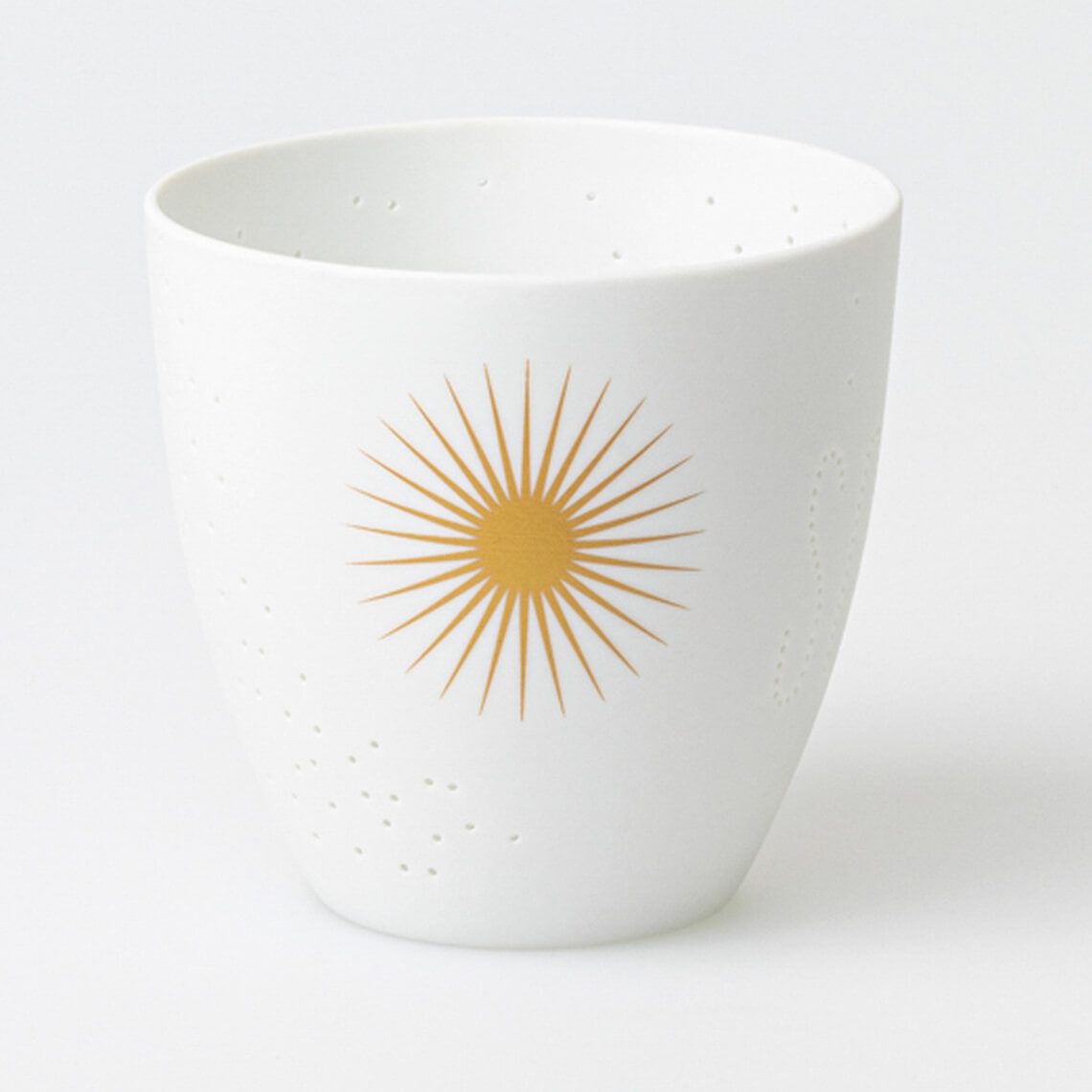 Porzellanlicht mit goldener Sonne und dem Schriftzug "Sommerlicht" als Lochmuster.