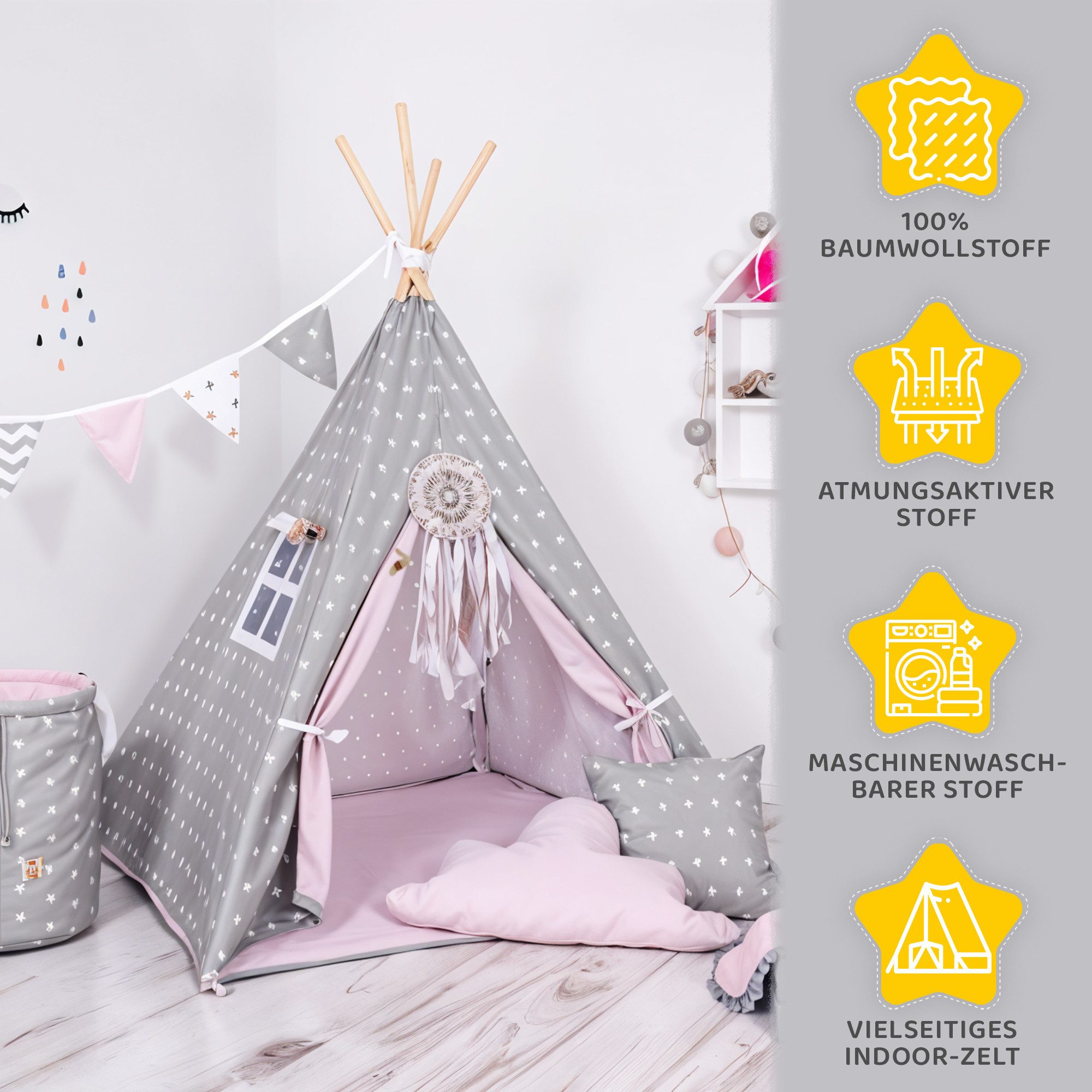 [Mit Zubehör ]- Das Set besteht aus insgesamt 8 Elemente dem Tipi mit Decke und 4 Kissen , Wimpelkette und mit dem Spielzeugkorb !!