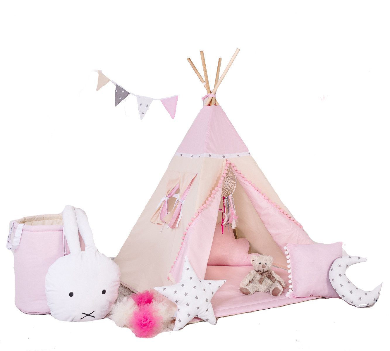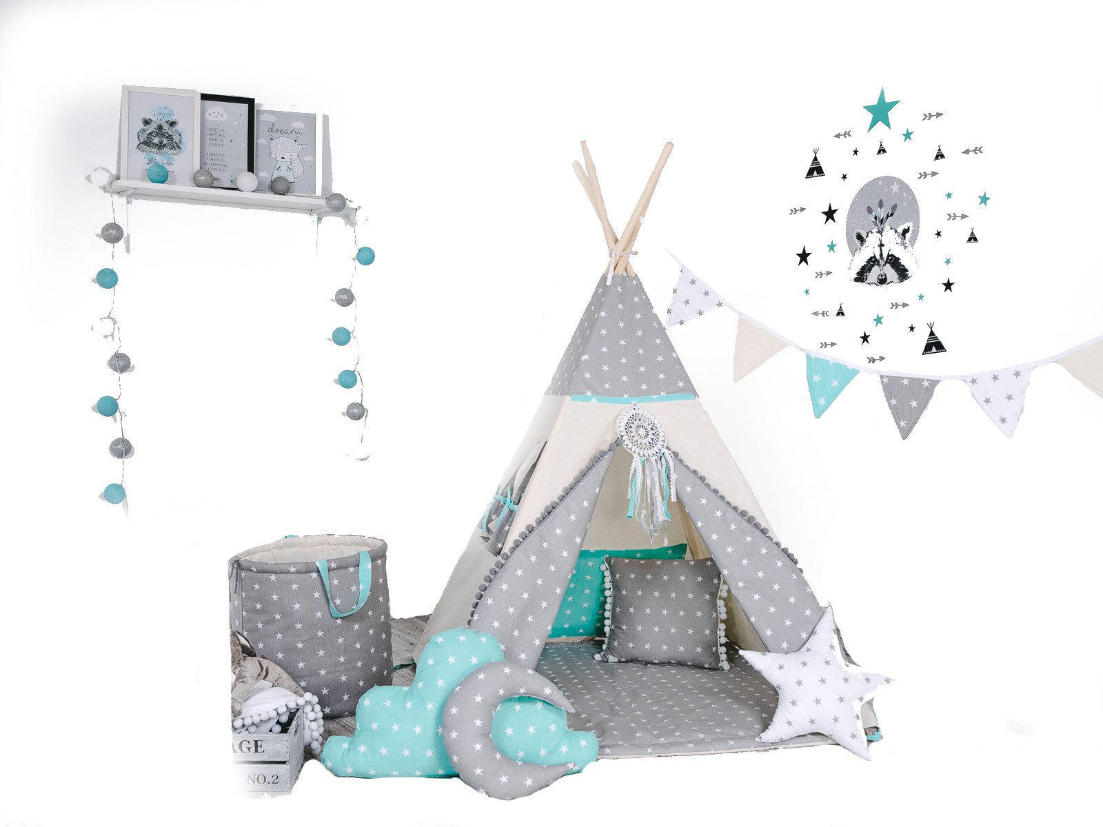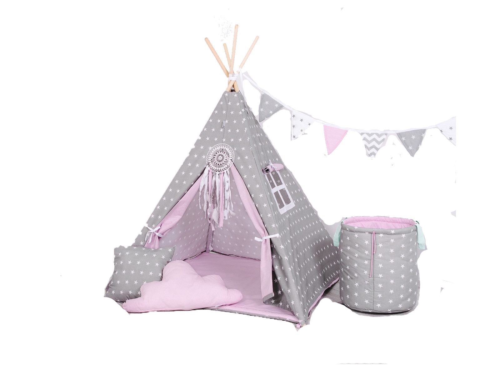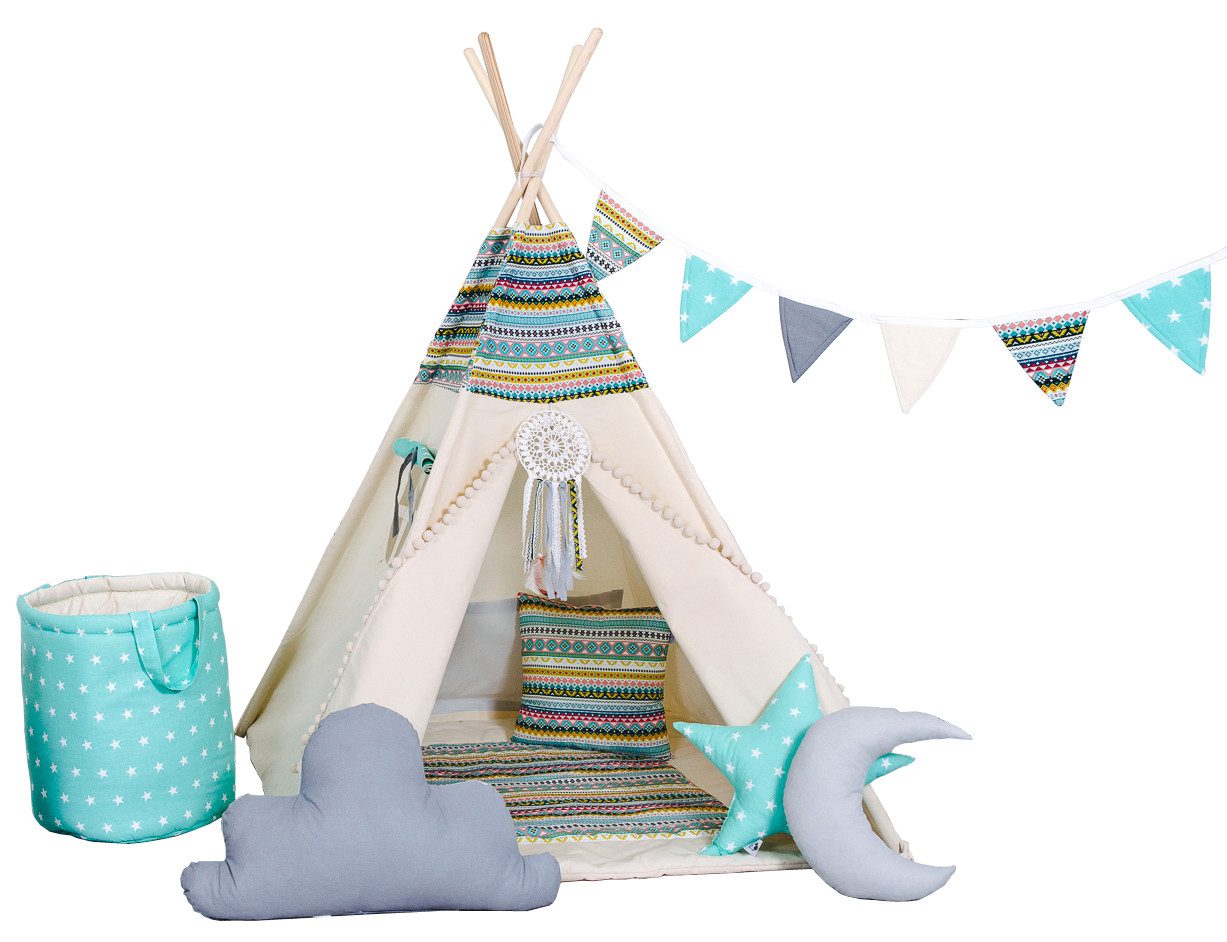 Tipi 4 Kissen Spielzeugkorb Wimpelkette Bodenmatte