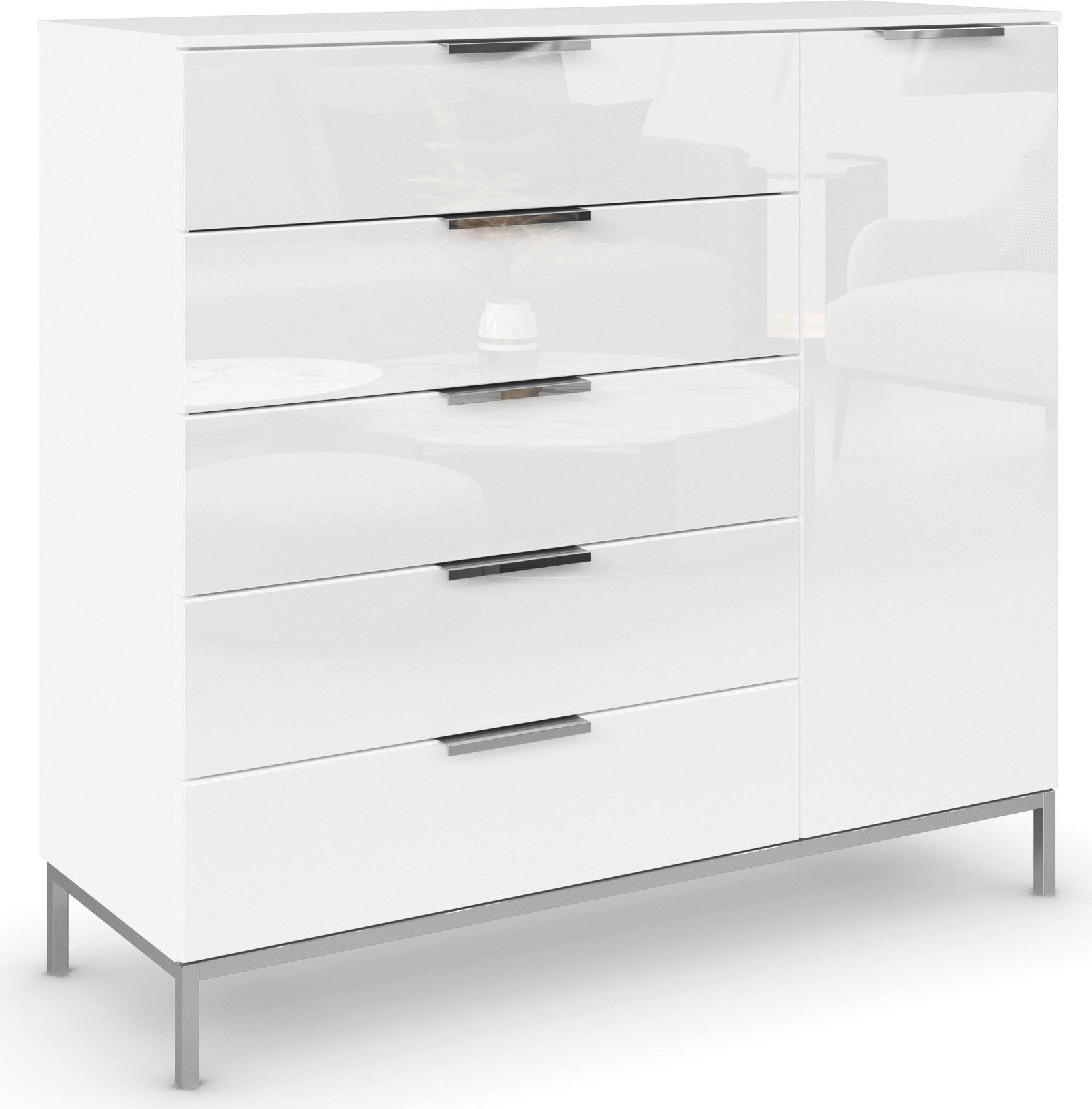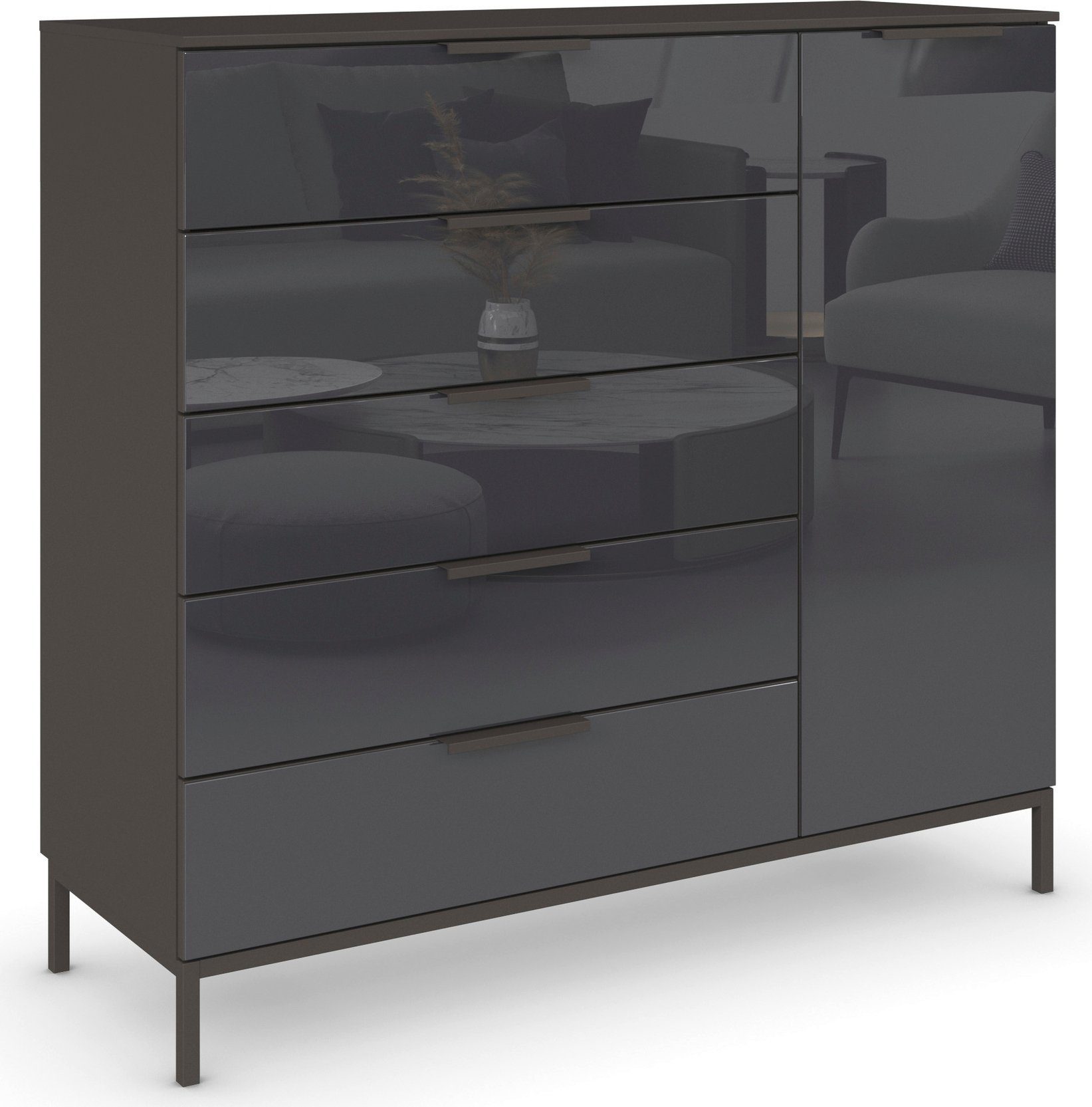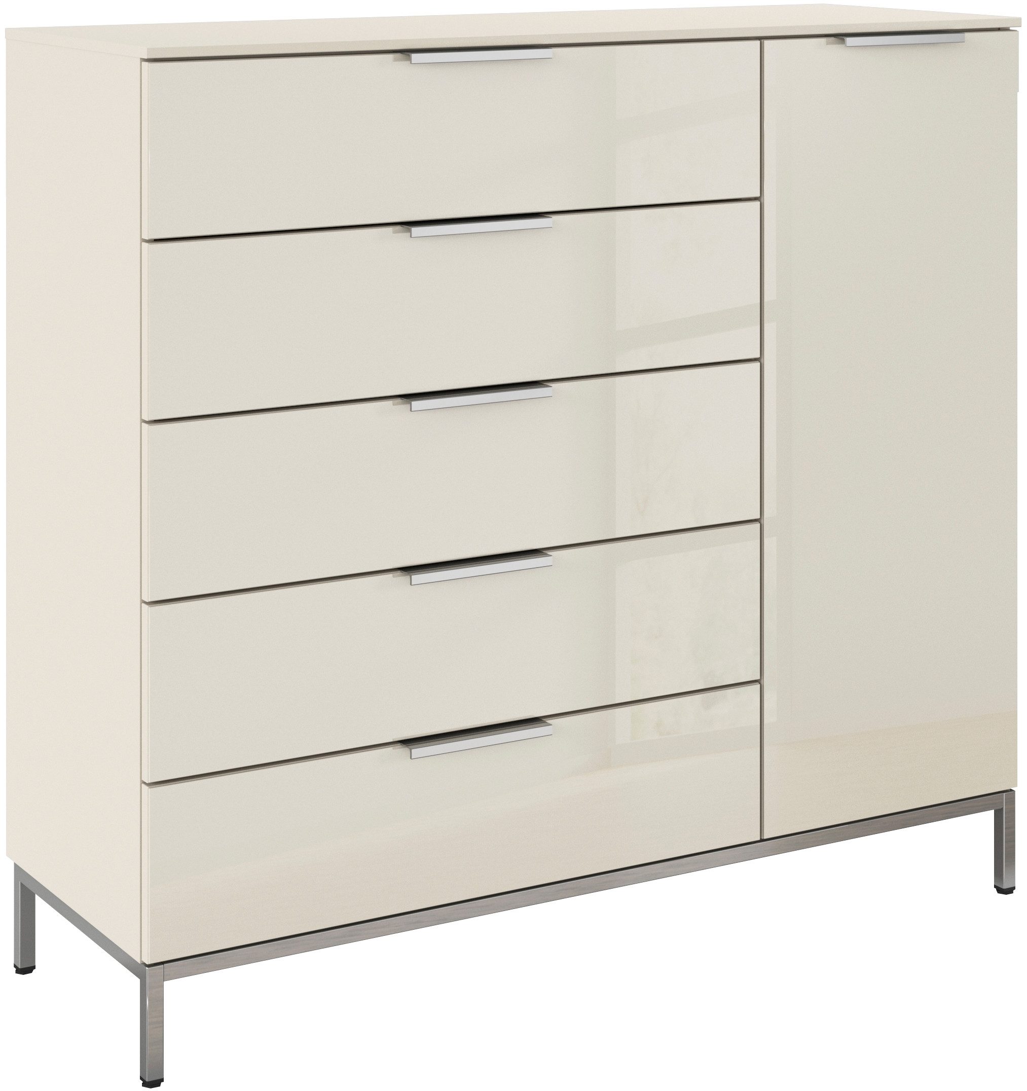Die Kommode »FLIPP« von rauch ist nicht nur ein Möbel, sondern ein Statement für modernes Design und clevere Organisation. Dank der breiten Farbauswahl - darunter auch die wohnlich warme Nuance Beige - kannst du dir deinen Wohnraum ganz individuell und nach deinen Wünschen einrichten. Ein Highlight der Kommode ist die Front mit Glasauflage, die dem Möbelstück einen Hauch von Eleganz verleiht und ganz luftig und leicht wirkt. Ausgestattet mit einem Fußgestell aus Metall, wirkt die Kommode besonders filigran und sorgt für eine zeitlose Optik. Mit fünf großzügigen Schubkästen und einer Tür bietet sie dir reichlich Stauraum, um deine Habseligkeiten übersichtlich und geordnet zu halten. Die Schubkästen verfügen über Selbsteinzug und Dämpfung, wodurch sie leise geschlossen werden können – für eine ruhige Atmosphäre in deinem Zuhause. Auch die Tür ist mit Scharnierdämpfung ausgestattet, was ein behutsames Сховати gewährleistet. Die farblich passenden Griffe runden das moderne Design ab.