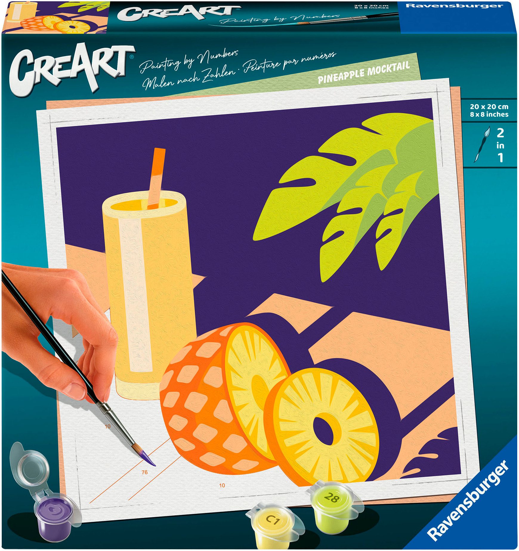 Lieferumfang | 1 Maltafel im Format 20x20cm) 1 Qualitätspinsel 11 Acrylfarben auf Wasserbasis in wiederverschließbaren Näpfchen Anleitung Farbpalette |