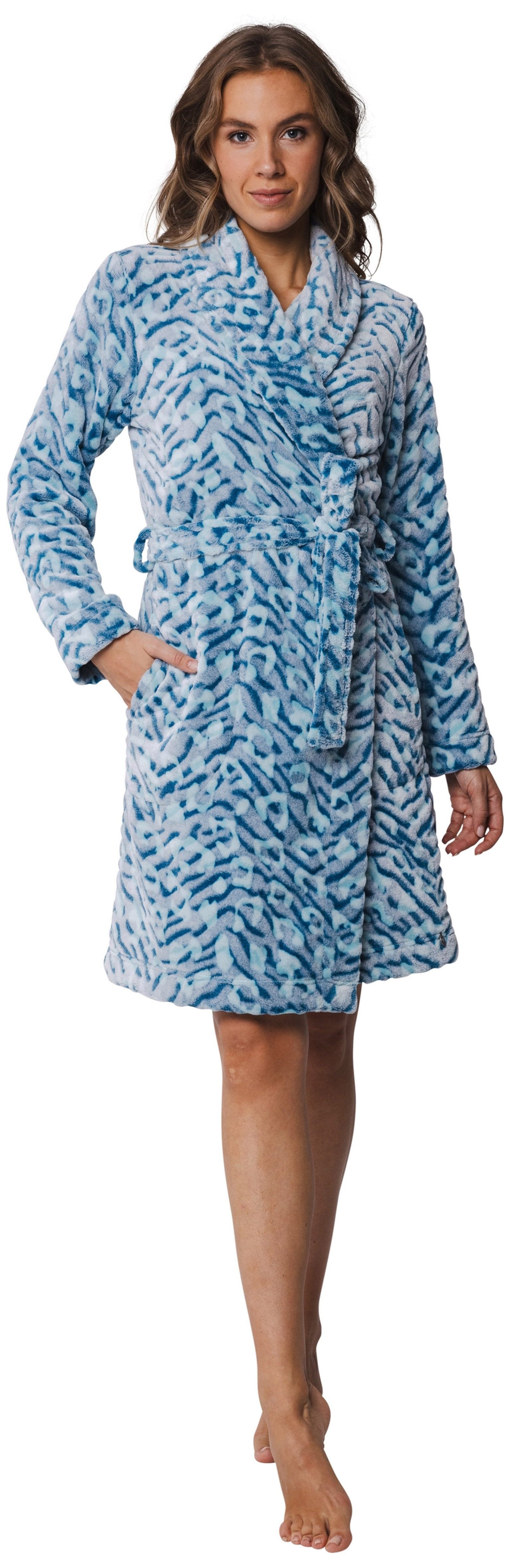Dieser Rebelle Damen Bademantel ist ein gemütliches und komfortables Kleidungsstück, ideal für den Einsatz nach dem Duschen, Baden oder für entspannte Stunden zu Hause. Material: Hergestellt aus 100 % Polyester-Fleece, was für ein weiches, warmes und leichtes Tragegefühl sorgt. Fleece ist bekannt für seine Wärmespeicherung und Atmungsaktivität. Klassischer Schalkragen, der dem Bademantel einen eleganten und zeitlosen Look verleiht. Der Kragen schmiegt sich sanft an den Hals und bietet zusätzlichen Komfort und Wärme. Mit einer Довжина von 100 cm reicht der Bademantel bis knapp über das Knie, was ihn perfekt für unterschiedliche Körpergrößen und Situationen macht. Bequeme und lockere Passform, die Bewegungsfreiheit bietet, ideal zum Relaxen oder für die tägliche Pflegeroutine. Dieser Bademantel bietet optimalen Komfort und ist eine großartige Wahl für Damen, die ein leichtes, kuscheliges und praktisches Kleidungsstück suchen.
