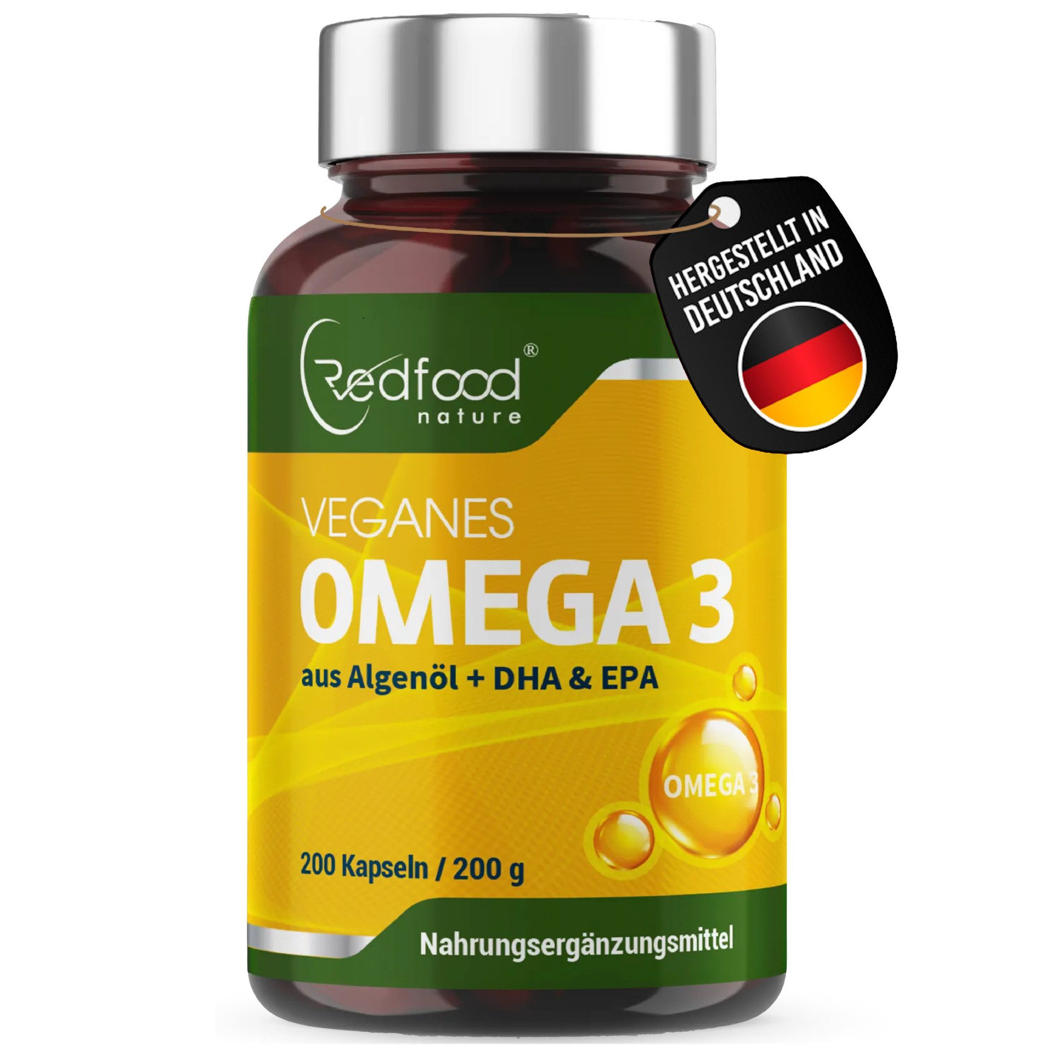 Entdecke die veganen Omega-3-Kapseln – Deine pflanzliche Quelle für essenzielle Fettsäuren In unserer schnelllebigen Welt ist es wichtiger denn je, auf die eigene Gesundheit zu achten. Mit den veganen Omega-3-Kapseln setzt du auf ein hochwertiges Nahrungsergänzungsmittel, das einen neuen Standard setzt. Diese hochdosierten Kapseln liefern dir alles, was du brauchst, ohne auf Fischöl zurückgreifen zu müssen. Ganz natürlich und ohne unerwünschte Nebenwirkungen. Die Kraft der Algen Während viele Omega-3-Produkte aus Fischöl gewonnen werden, stammen unsere Fettsäuren aus Algen (Schizochytrium sp.) – eine reine, pflanzliche Alternative. Jede Kapsel enthält 1000 mg Algenöl, davon 550 mg Omega-3-Fettsäuren, einschließlich 300 mg DHA (Docosahexaensäure) und 150 mg EPA (Eicosapentaensäure). Diese bioaktiven Fettsäuren stammen direkt aus der Pflanze und können sofort vom Körper genutzt werden, ohne dass eine Umwandlung nötig ist. Dank der natürlichen Triglyceridform wird die Aufnahme der Fettsäuren optimal unterstützt, sodass dein Körper das Maximum aus jeder Kapsel ziehen kann. Zudem stammen unsere Algen aus Aquakulturen, frei von Schwermetallen und anderen Schadstoffen, die oft in Fischölen zu finden sind. Du tust also nicht nur deinem Körper etwas Gutes, sondern auch der Umwelt. Perfekt für alle Ob du vegan lebst, allergisch auf Fischprodukte reagierst oder einfach nach einer umweltfreundlichen Alternative suchst – unsere veganen Omega-3-Kapseln sind die ideale Lösung. Sie sind eine unkomplizierte Möglichkeit, deinen täglichen Bedarf an wertvollen Fettsäuren zu decken und gleichzeitig deinen ökologischen Fußabdruck zu minimieren. Eine Entscheidung für deine Gesundheit und unseren Planeten! Gesundheitliche Vorteile von Omega-3 – Die Power für Herz, Gehirn und Augen Omega-3-Fettsäuren bieten vielfältige gesundheitliche Vorteile, die du dir nicht entgehen lassen solltest. Insbesondere EPA und DHA tragen zur normalen Funktion deines Herzens bei. Sie unterstützen einen gesunden Cholesterin- und Triglyceridspiegel und tragen so zu einem stabilen Blutdruck bei – alles entscheidend für dein Herz-Kreislauf-System. DHA spielt zudem eine wichtige Rolle für das Gehirn und die Sehkraft. Da der Körper diese wertvollen Fettsäuren nicht selbst herstellen kann, ist eine externe Zufuhr über die Nahrung oder Nahrungsergänzungsmittel unerlässlich. Mach den ersten Schritt in Richtung eines gesünderen Lebens – probiere die veganen Omega-3-Kapseln aus und spüre den Unterschied!