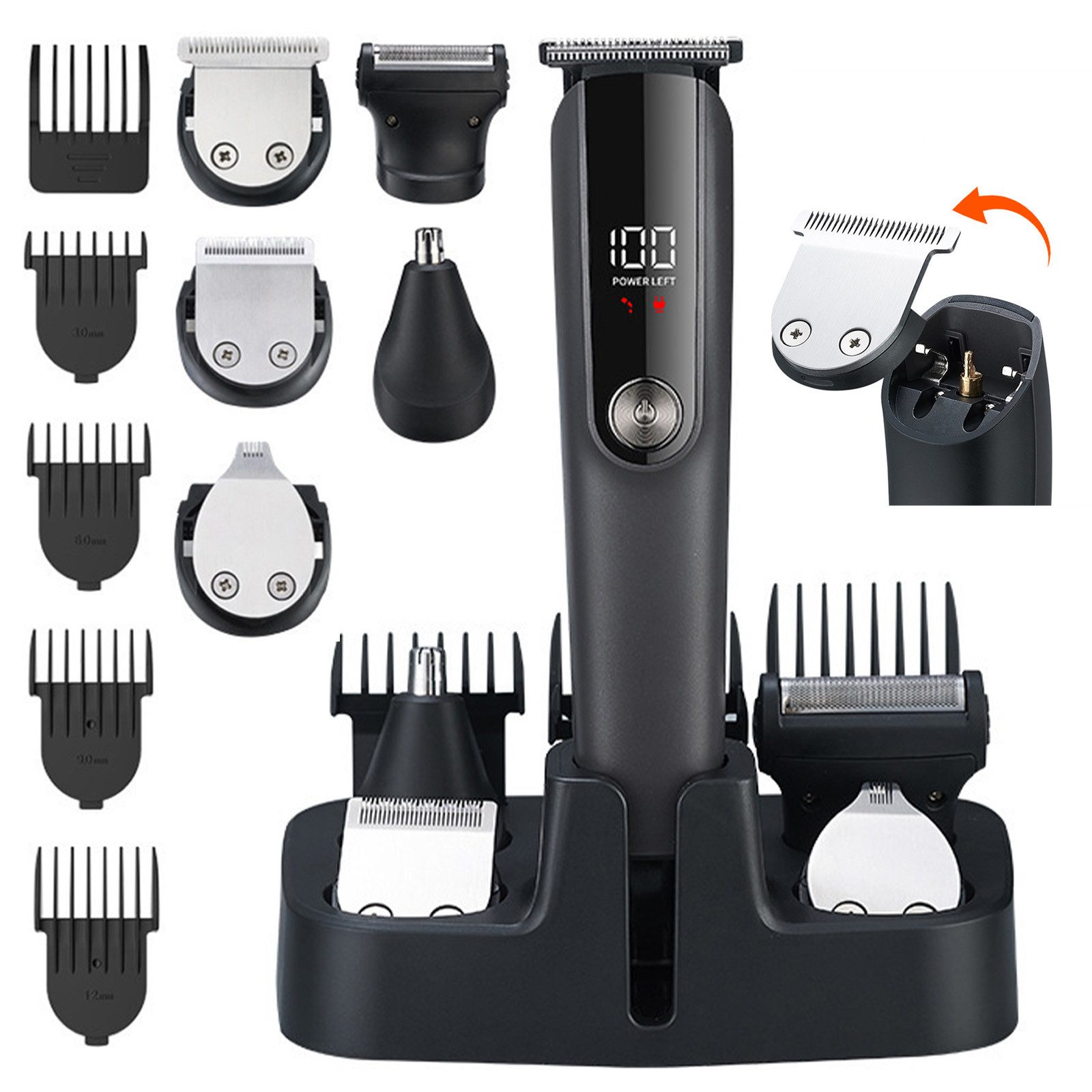 Fünf austauschbare Trimmerköpfe – für Bart, Körper, Nase, Ohren und präzise Konturen – decken alle Pflegebedürfnisse ab.