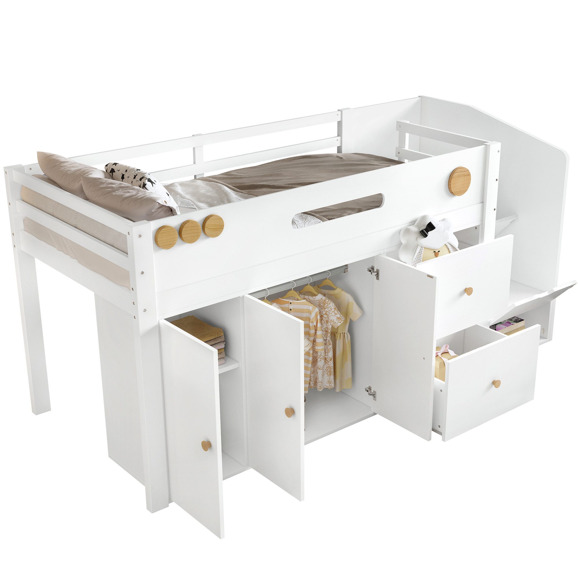 Vielseitiger Stauraum für Ordnung: Zwei geräumige Schubladen und ein eingebauter Kleiderschrank schaffen umfangreichen Platz zur Aufbewahrung von Kleidung, Spielzeug oder Bettwäsche. So bleibt das Kinderzimmer stets ordentlich und aufgeräumt.
