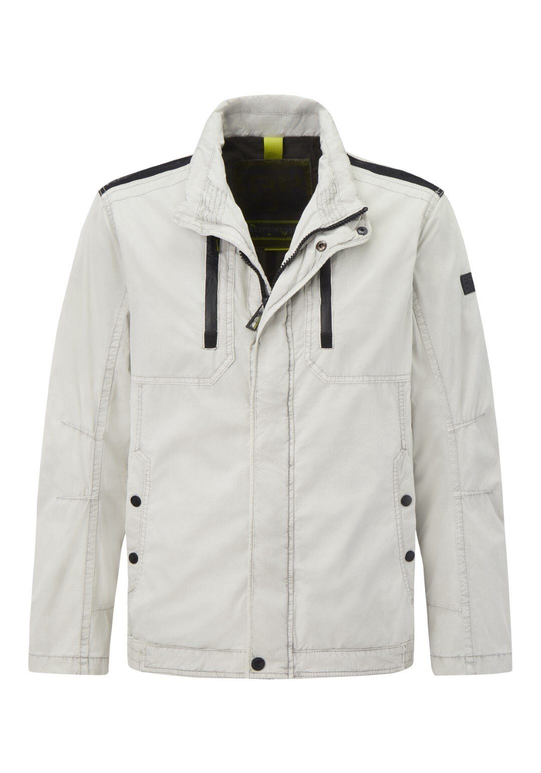 Taschen | Innentasche links mit Reißverschluss, rechts Innentasche mit Klettverschluss. Außentaschen: zwei seitliche Eingrifftaschen mit Druckknopf, zwei senkrecht gestellte Brusttaschen mit Reißverschluss. |