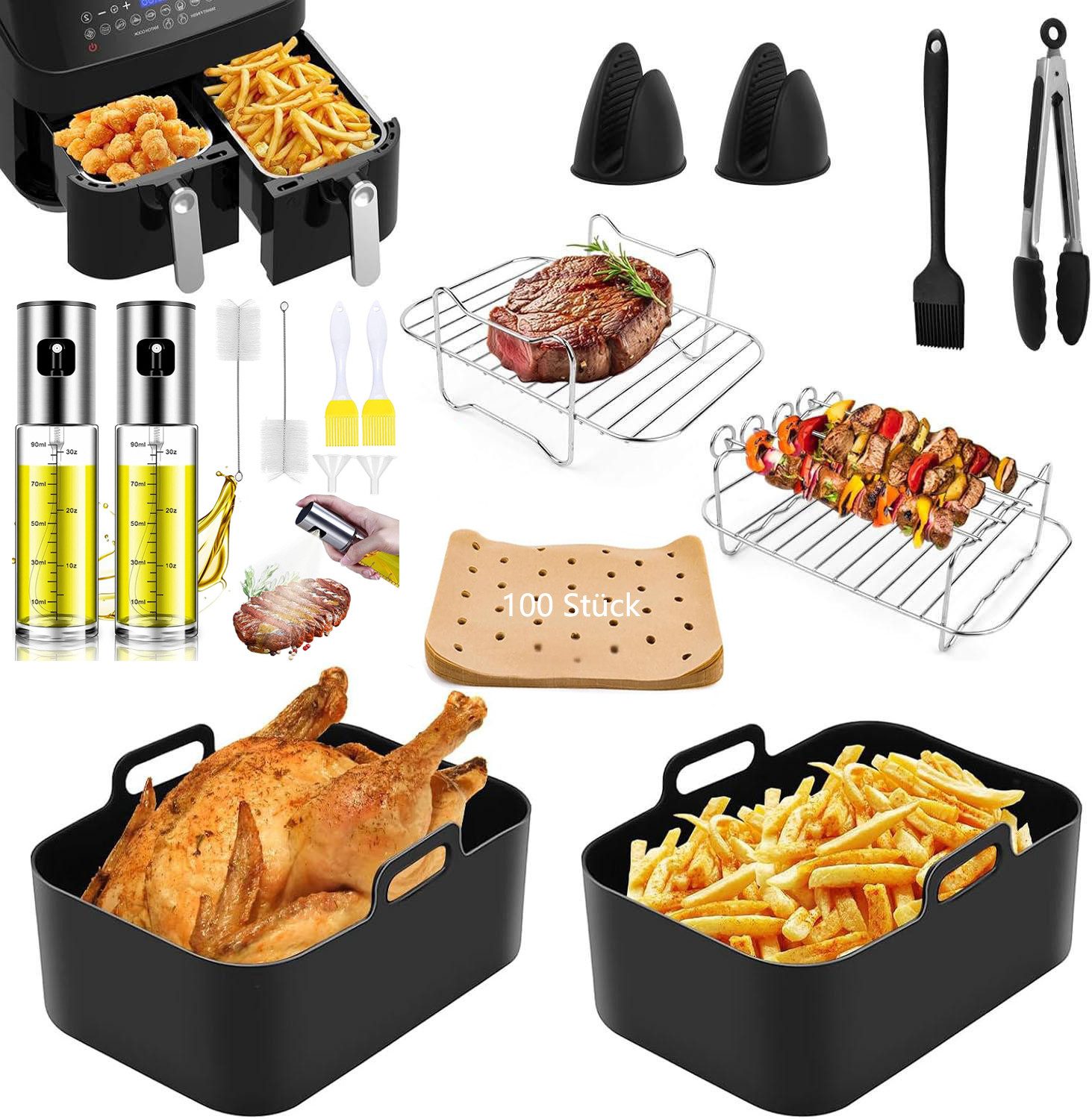 Zwei Bestseller in einem Set: Airfryer-Zubehör (9-teilig) + 2 hochwertige Ölsprüher mit Zubehör