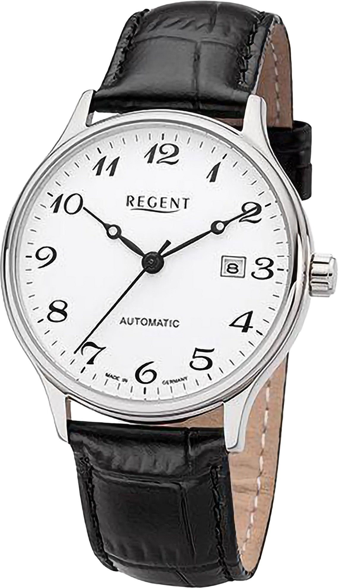 Die Casual Uhr der Marke Regent hat ein schönes Armband aus Leder in schwarz mit Dornschließe. Eine Uhr aus der Regent Lederarmband Kollektion für Herren in der Gehäusefarbe silber mit Automatik. Die Analoguhr mit Saphirglas hat ein Zifferblatt in der Farbe weiß. Die Form der Uhr ist rund und das Gehäuse ist groß ca. 40mm im Durchmesser.