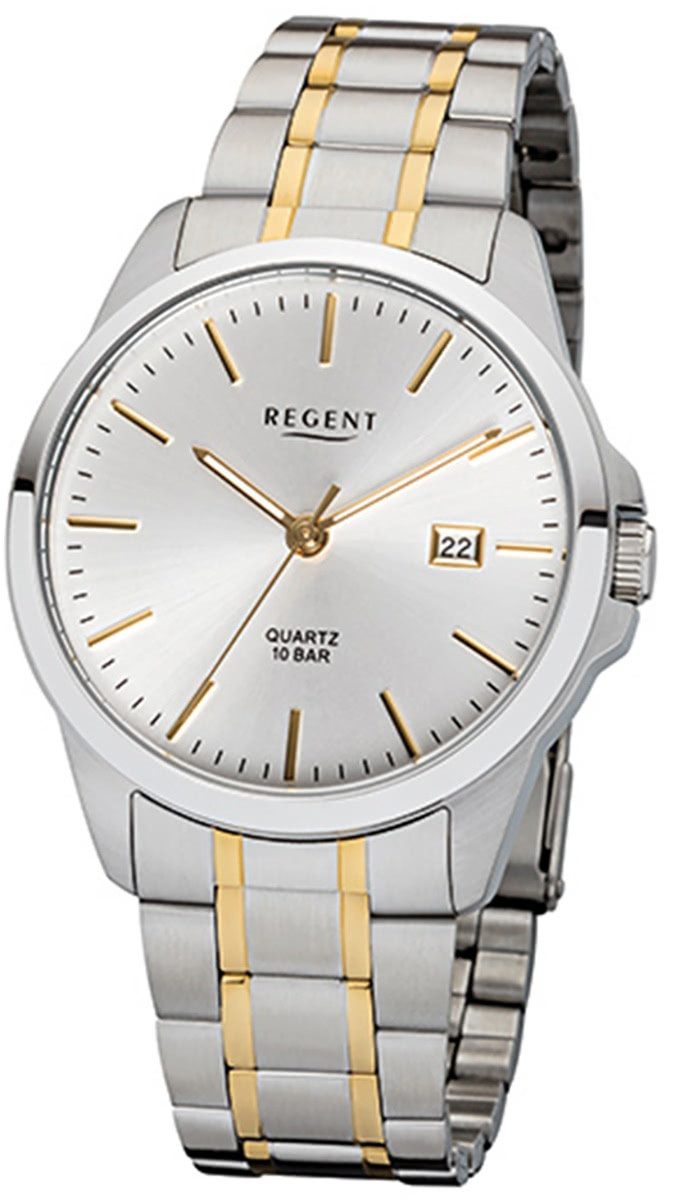 Die Elegant Uhr der Marke Regent hat ein schönes Armband aus Edelstahl in silber gold mit Sicherheits-Faltschließe. Eine Uhr aus der Regent Metallarmband Kollektion für Herren in der Gehäusefarbe silber mit Quarzwerk. Die Analoguhr mit Mineralglas hat ein Zifferblatt in der Farbe silber. Die Form der Uhr ist rund und das Gehäuse ist mittel ca. 39mm.
