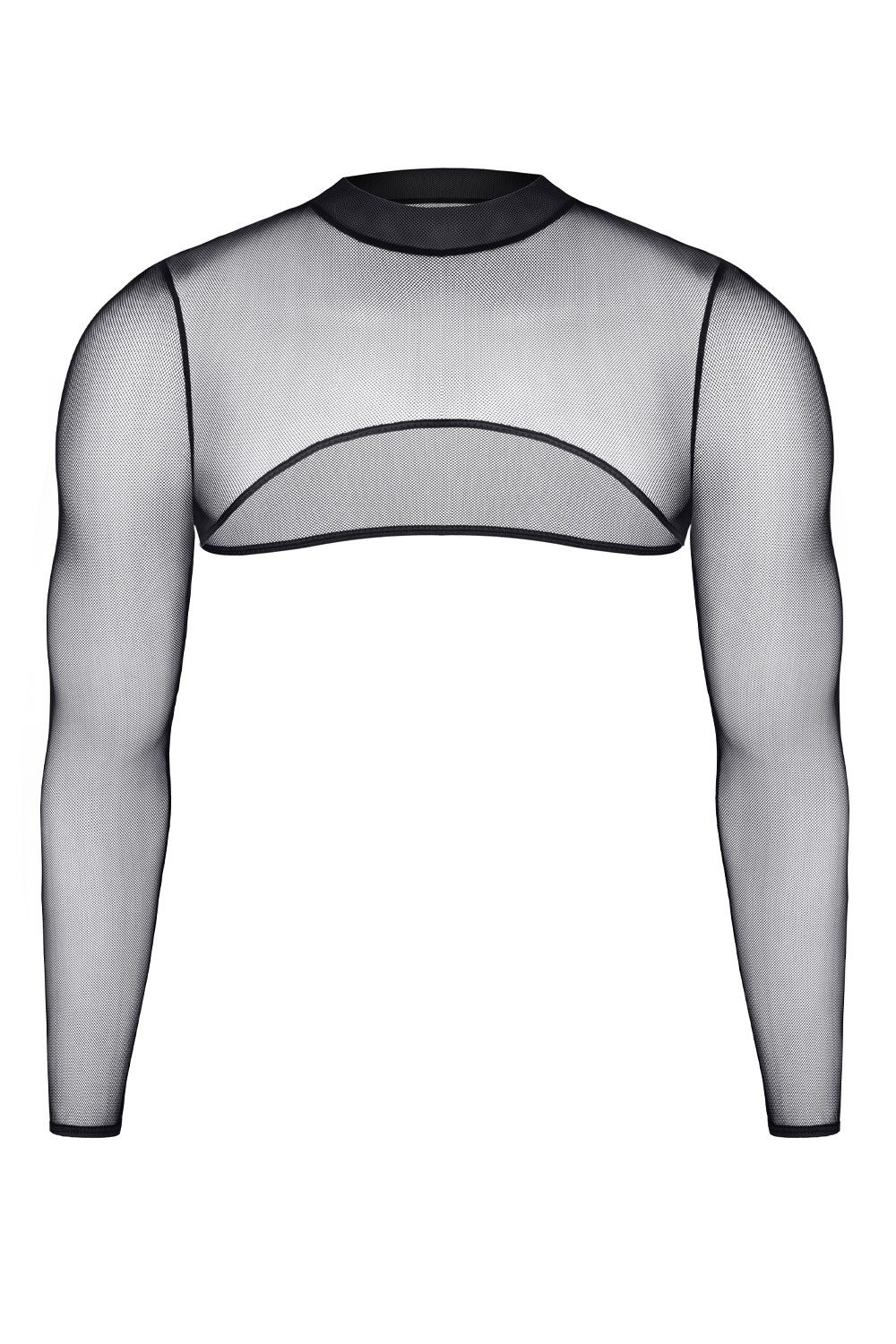 Männer Crop-Top komplett aus sehr dehnbarem und elastischem Tüll in Schwarz. Verbreitert effektiv die Schultern und die Brust und bringt den nackten Rücken und Oberkörper zum Vorschein. Ermöglicht den Zugang zu den Brustwarzen die zum Spielen verwendet werden können und sollten. Am Umfang im unteren Teil und an den Ärmeln mit Gummiband abgeschlossen. Durch diese Lösung und die elastischen Eigenschaften des Materials passt es sich perfekt an den Körper an und unterstreicht seine Vorteile.