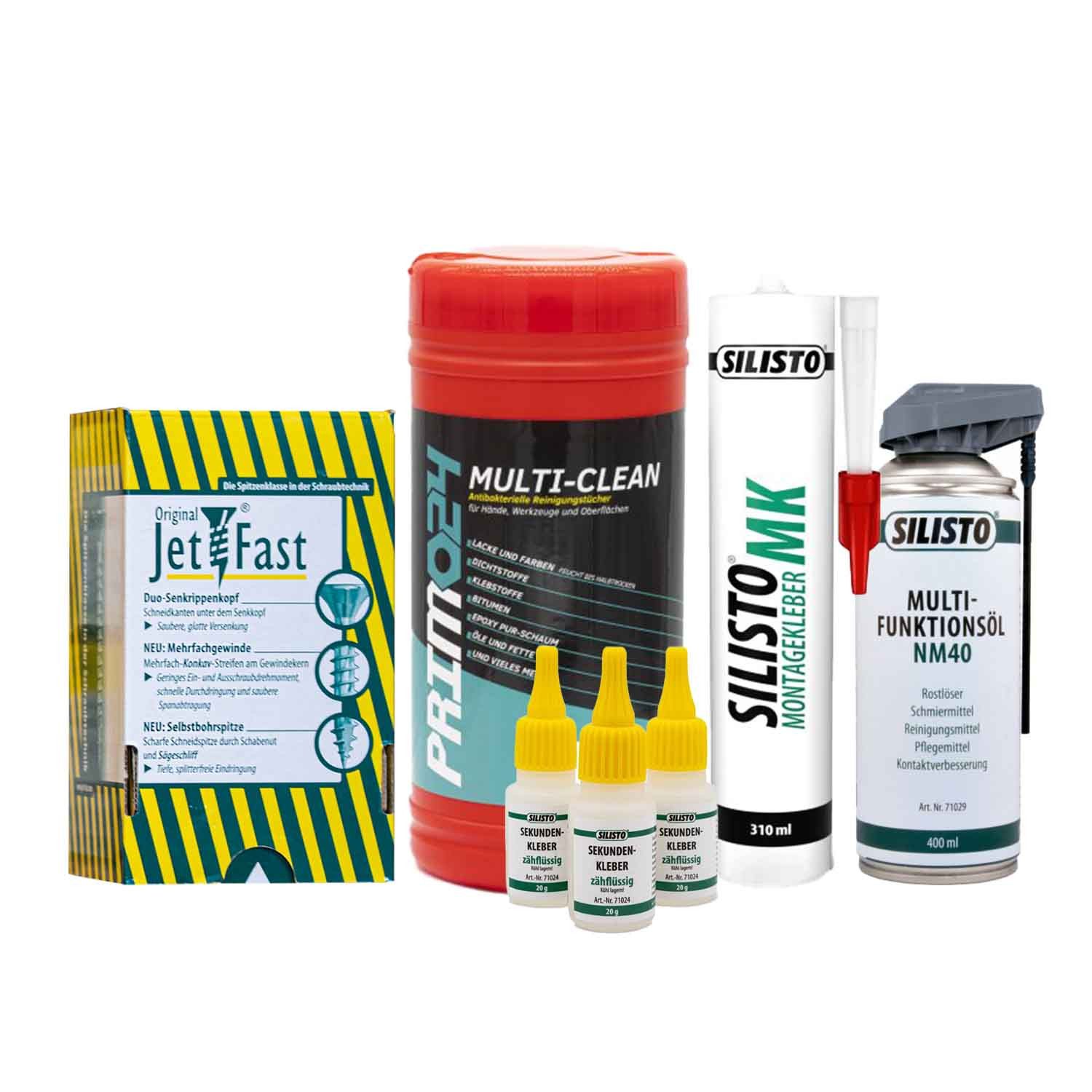 Der zähflüssige Sekundenkleber ermöglicht eine dauerhafte und zuverlässige Verbindung verschiedenster Materialien. Der haftintensive Montagekleber MK eignet sich hervorragend für diverse Untergründe. Das Vielzweckspray NM 40 zeigt sich als wahres Multitalent, indem es Rost löst, schmiert, reinigt und pflegt. Die MULTI-CLEAN Reinigungstücher fungieren als vielseitiges Reinigungsmittel für Hände, Werkzeuge und Oberflächen. Die Jet-Fast Universalschrauben gewährleisten einen sicheren Halt in unterschiedlichsten Holzwerkstoffen.