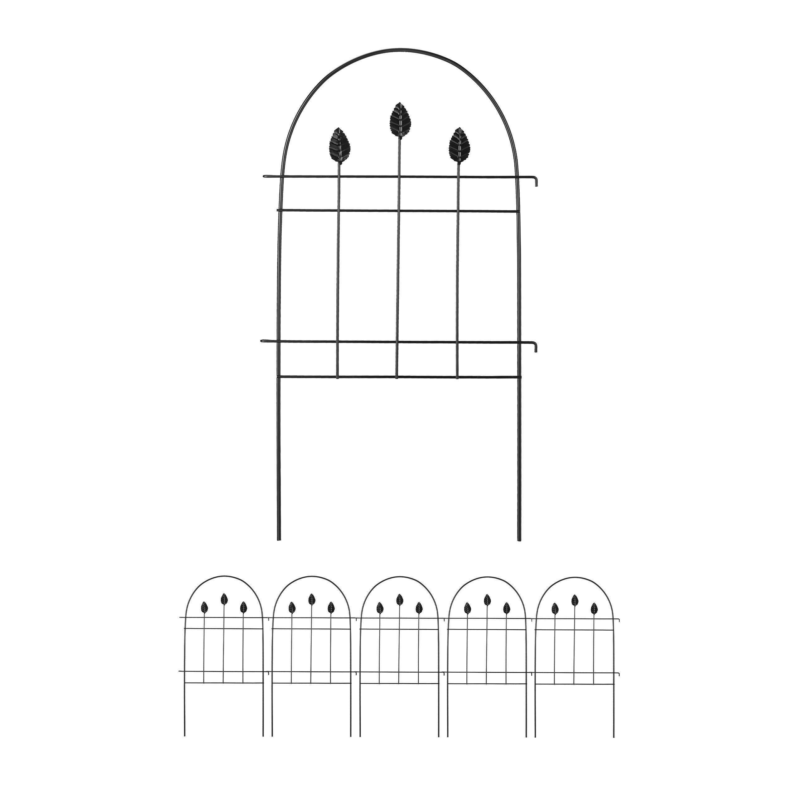 Mit dieser dekorativen Beeteinfassung gestaltest und verschönerst Du Deinen Garten schnell und einfach. Markiere die Übergänge zwischen Beeten, Grünflächen, Wegen und Rabatten mit dem niedrigen Zierzaun. Dazu werden die 6 Zaunelemente mit den Erdspießen einfach in den Boden gedrückt. Die schwarze Beetbegrenzung lässt sich je nach Bedarf flexibel anordnen. Mit seinem antiken Design samt zierenden Blättern wird der Steckzaun aus Eisen dabei sicher zum Hingucker in Deinem Außenbereich.