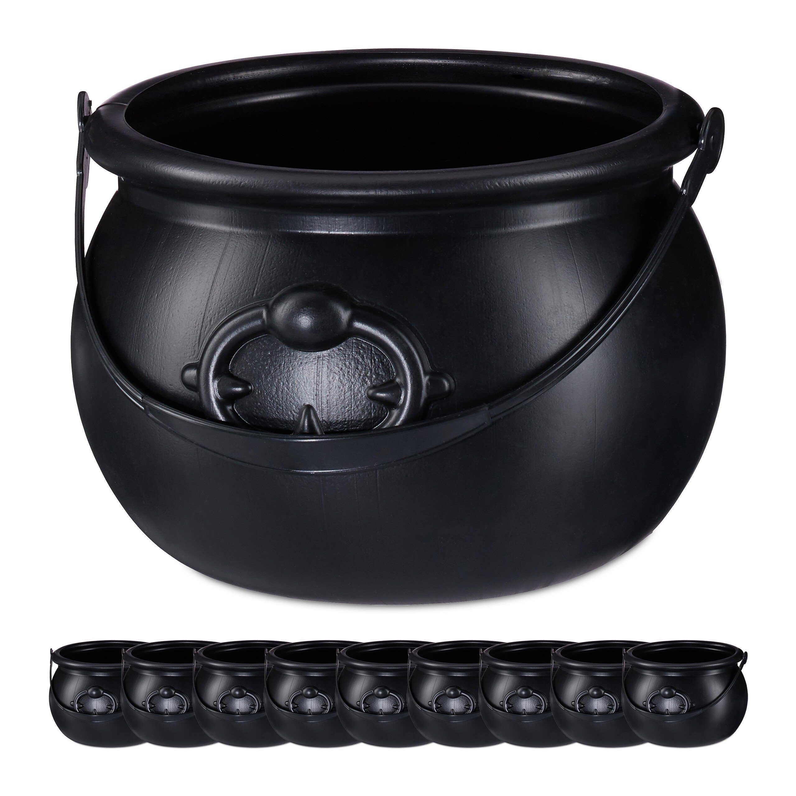 Der schwarze Hexenkessel aus Kunststoff hat so viele Talente, dass es eigentlich nur mit Magie zu erklären ist. Er punktet als Zauberkessel, mit dem Hexen und Zauberer auf der nächsten Faschings- und Halloweenparty Zaubertränke brauen. Der Kessel ist aber auch ein handliches Behältnis für Süßigkeiten, wenn Kinder an Halloween von Tür zu Tür ziehen. Als Deko für eine schaurig-schöne Stimmung oder als Goldtopf für den St. Patrick’s Day lässt sich der Henkeltopf ebenso nutzen. Hexenkessel im Detail - Maße H x D: ca. 13 x 19 cm - Material: Kunststoff - Gewicht: ca. 100 g - Farbe: Schwarz - Im 10er Set