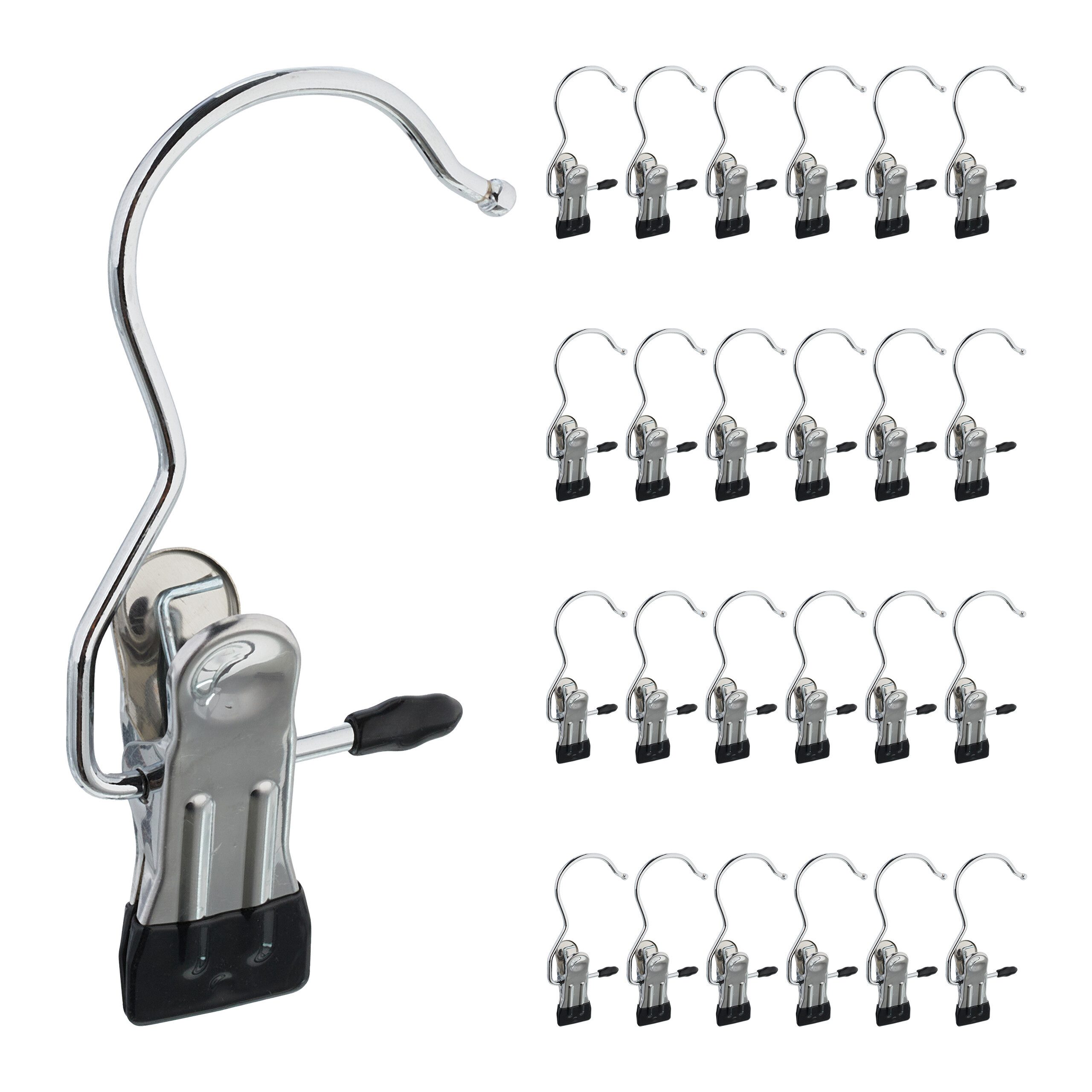 Vielseitige Klemmhaken zum Aufhängen - Praktisches 25er Set für Schuhe, Kleidung uvm. - Klammern und Haken lassen sich komplett drehen - Stabile Aufhängung mit Antirutsch-Funktion - Sorgen für mehr Ordnung im Kleiderschrank - Auch als Wäscheklammern verwendbar - Gummierung verhindert lästige Abdrücke