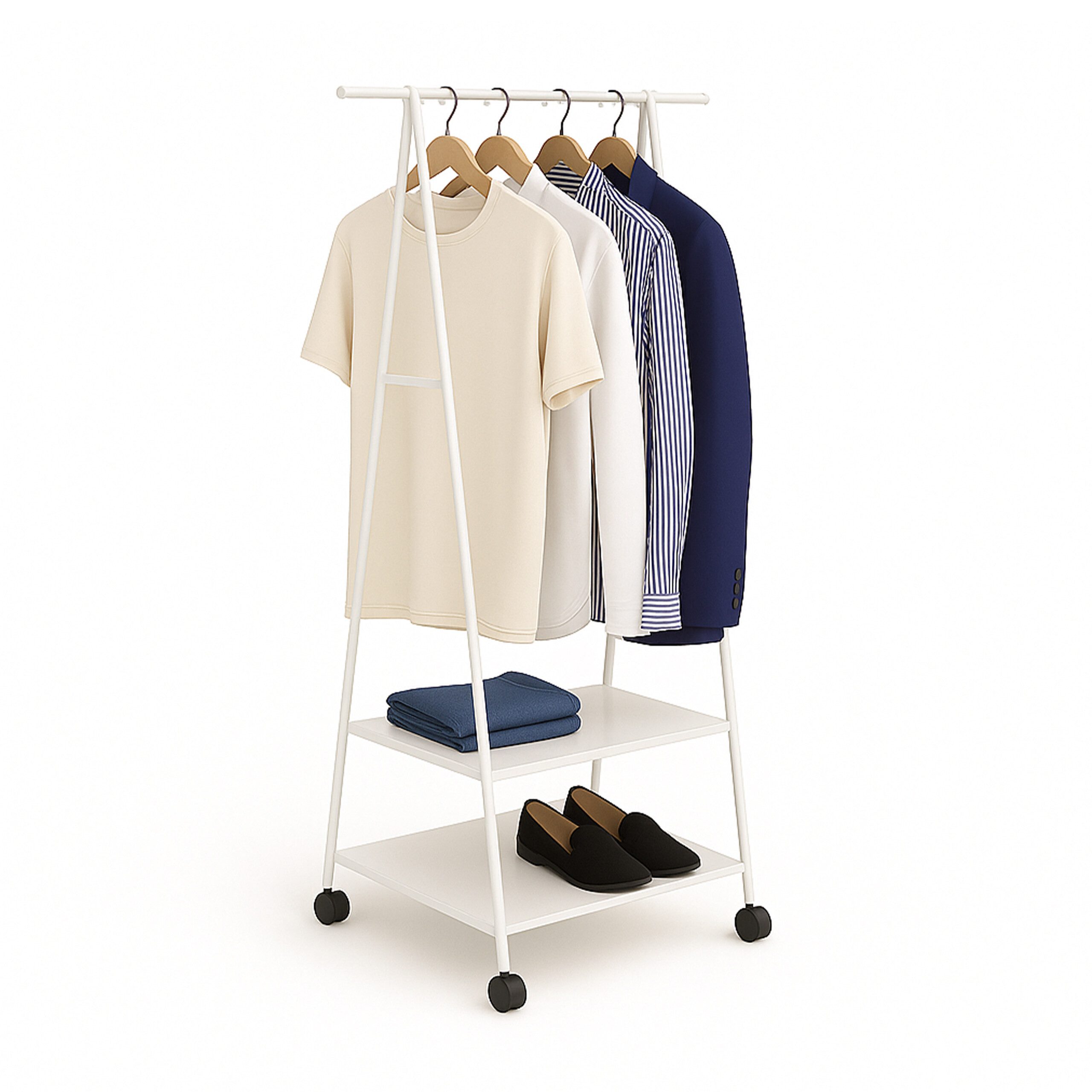 Mobiles Kleidergestell mit Ablagen - Zum Aufhängen von Hemden, Blusen, Kleidern uvm. - Mit 2 praktischen Ablagen für Schuhe und Taschen - Mobil dank 4 Rollen, 2 davon mit Feststellbremsen - Platzsparendes Design ist ideal für kleine Räume - Werkzeugloser Aufbau durch einfaches Stecksystem - Für Flur, Diele, Büro, Schlaf- und Ankleidezimmer Lieferumfang - 1x Garderobenständer in Einzelteilen - Mit Anleitung - Dekoartikel sind nicht im Lieferumfang enthalten