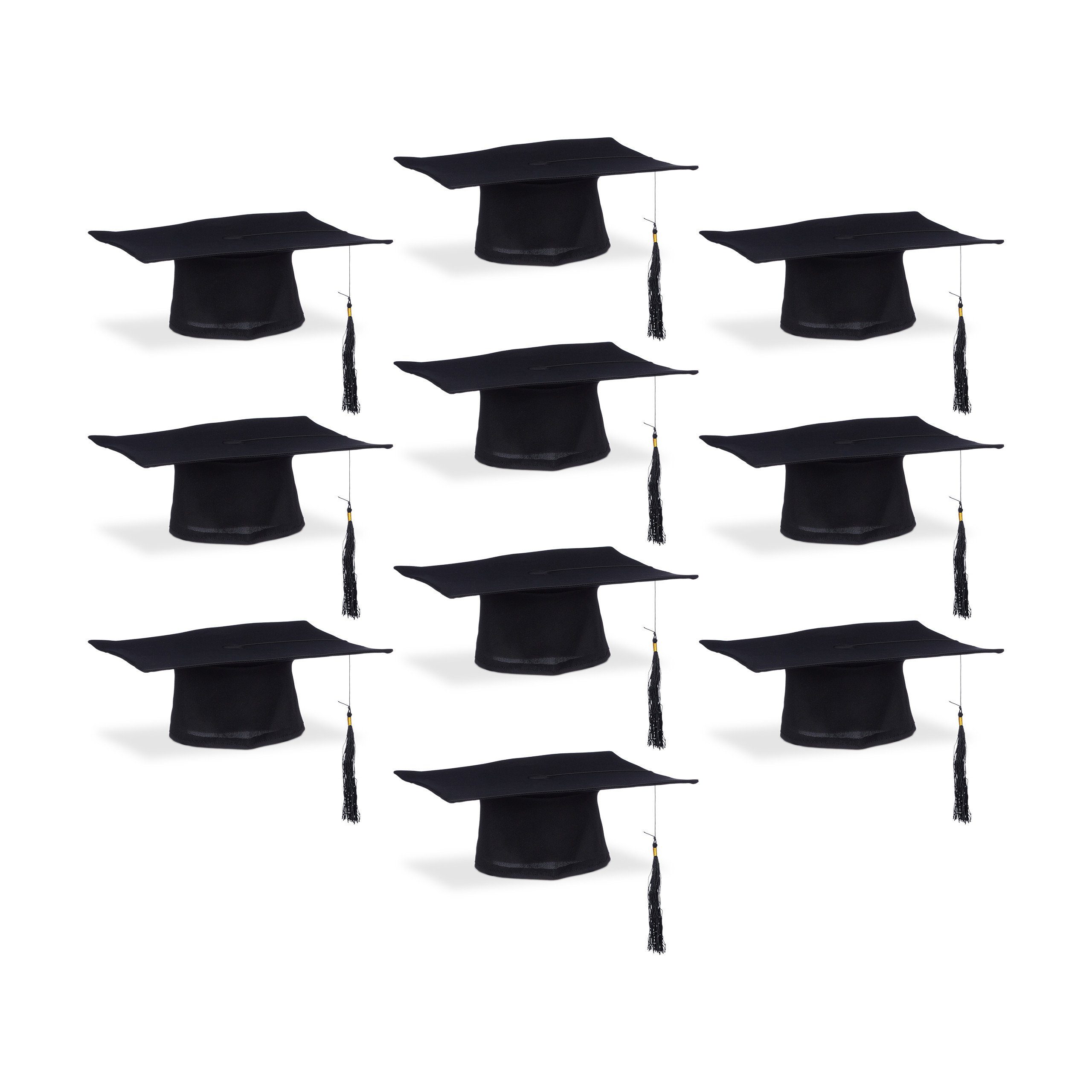 Doktorhut im 10er Set mit Quaste • Maße ausgeklappt H x B x T: ca. 12 x 28 x 28 cm • Gewicht: je ca. 0,1 kg • Material: 100% Polyester, schwarz • Verstärktes Rechteck • Für jeden Kopfumfang: Gummizug ist dehnbar • Keine Jahreszahl vermerkt