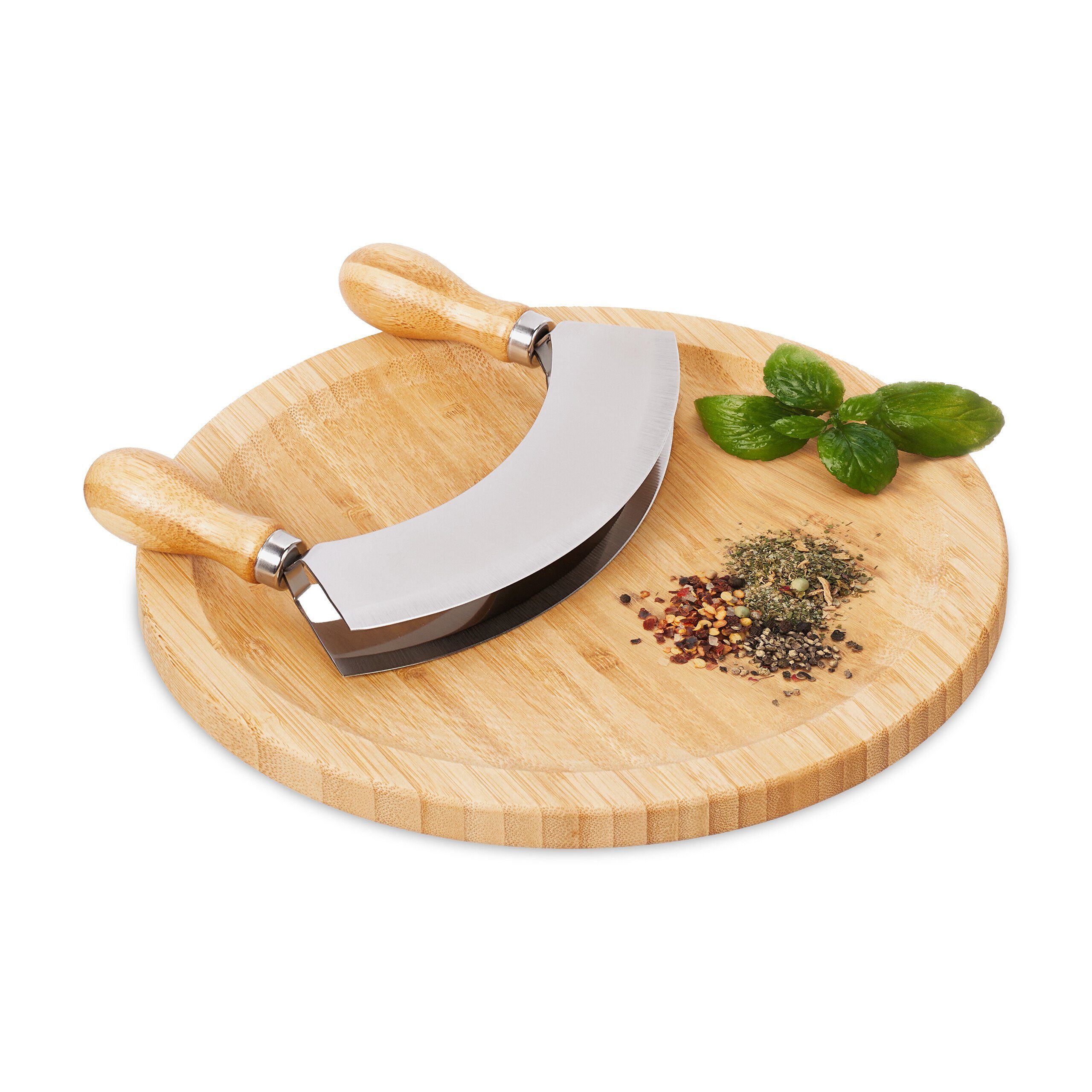 Details: Kräuterbrett aus Bambus HxD: ca. 1,5 x 25 cm - Wippmesser HxBxT: ca. 13,5 x 17,5 x 2,5 cm