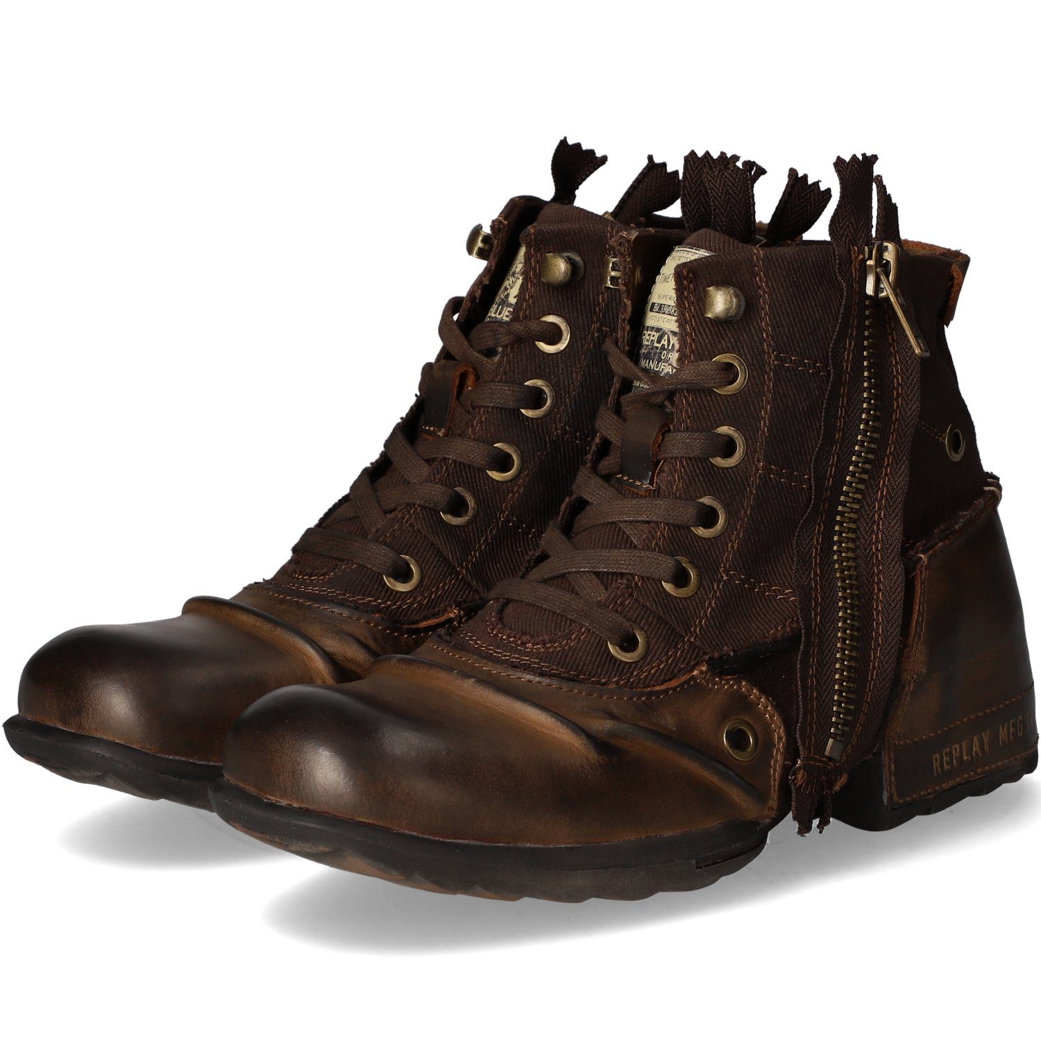 Replay Herren Biker Boots / Schnürboots Braun Glattleder-Textil-Mix - modische Ziernähte und Ziernieten - Faltenlook im Zehenbereich - zwei Reißverschlüsse - gelabelt - Retro-Motiv an der Zunge - Anziehlasche - Lederdecksohle - verstärkter Zehen- und Fersenbereich - flexible, rutschhemmende Laufsohle