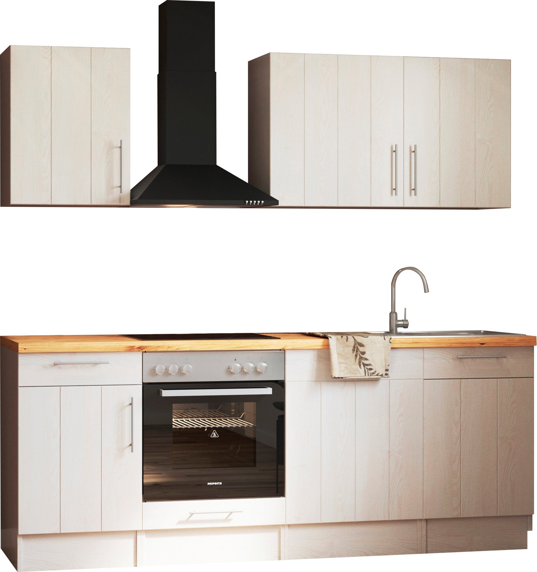 Ausstattung | Durchgehende Arbeitsplatte Schubkästen und Türen mit Soft-Close-Funktion Seitenverkehrt stellbar Sockelhöhe nicht verstellbar inkl. Edelstahl-Auflagespüle, mit Abtropffläche mit E-Geräten |