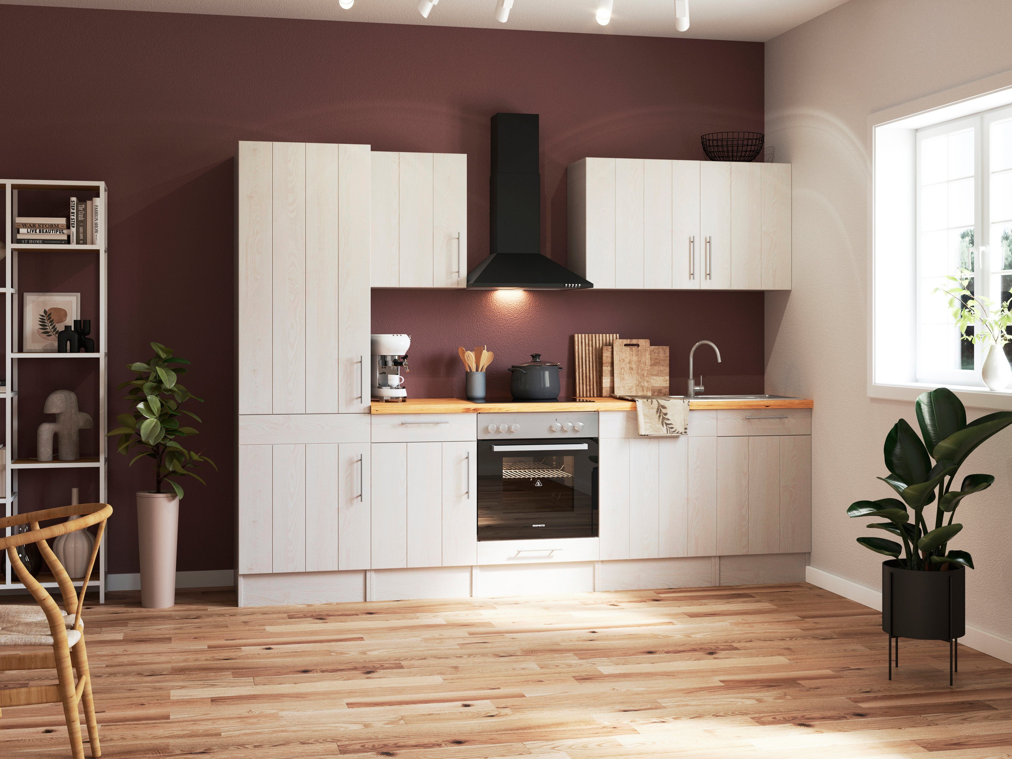 Ausstattung | Durchgehende Arbeitsplatte Schubkästen und Türen mit Soft-Close-Funktion Seitenverkehrt stellbar Sockelhöhe nicht verstellbar inkl. Edelstahl-Auflagespüle, mit Abtropffläche mit E-Geräten |